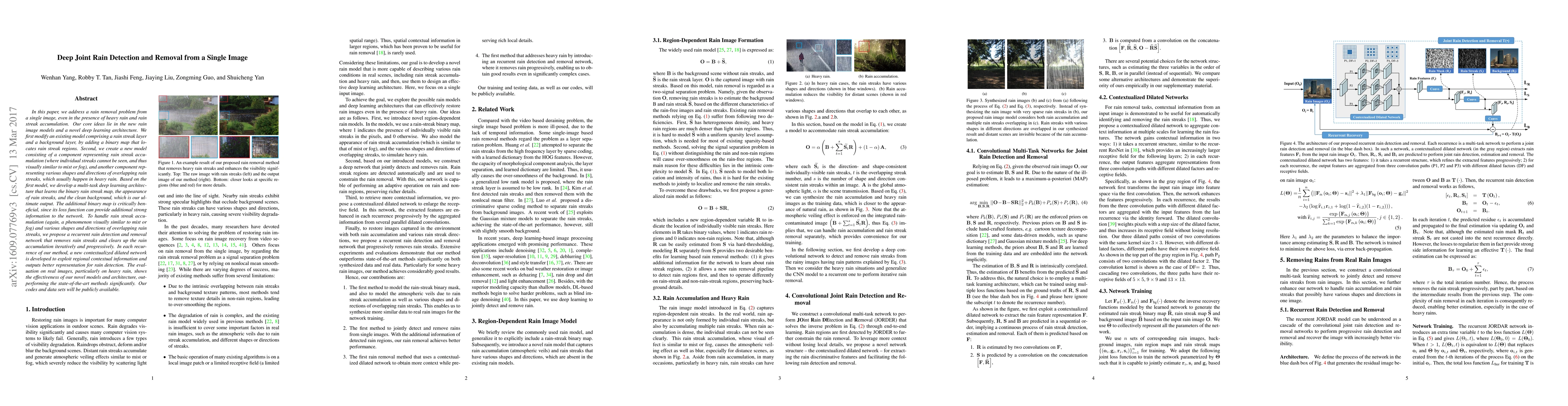 This paper proposes a deep learning architecture for rain detection and removal from single images, even under heavy rain conditions. It introduces a modified model with a binary map for rain streaks and a recurrent network for iterative removal, achieving superior results compared to existing methods.