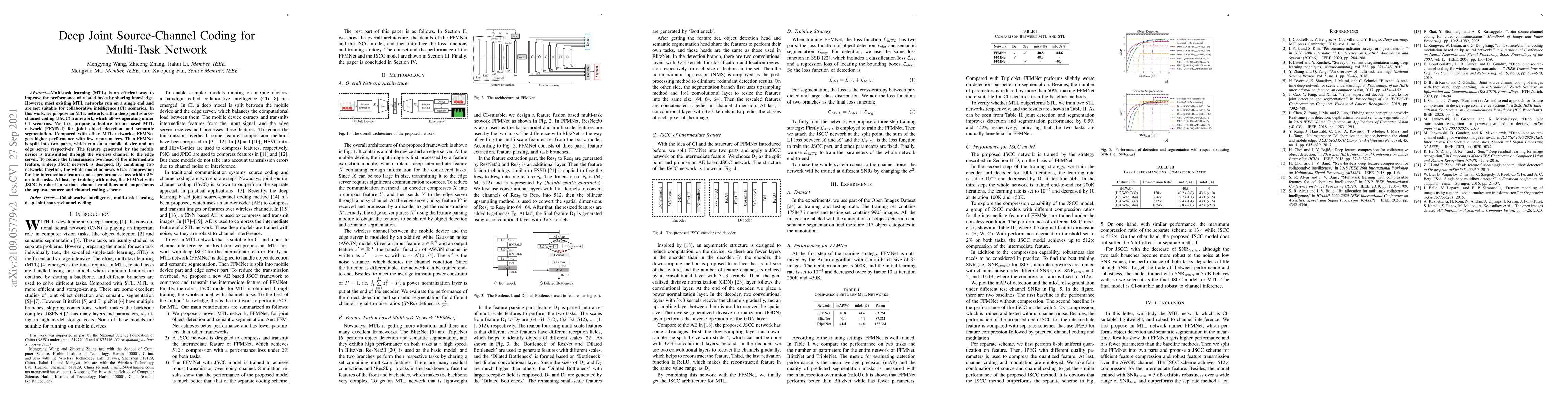 This paper proposes a deep joint source-channel coding (JSCC) framework for a multi-task network (FFMNet) that operates under collaborative intelligence scenarios. The FFMNet achieves higher performance with fewer parameters and splits into parts running on a mobile device and an edge server, achieving 512x compression and <2% performance loss.