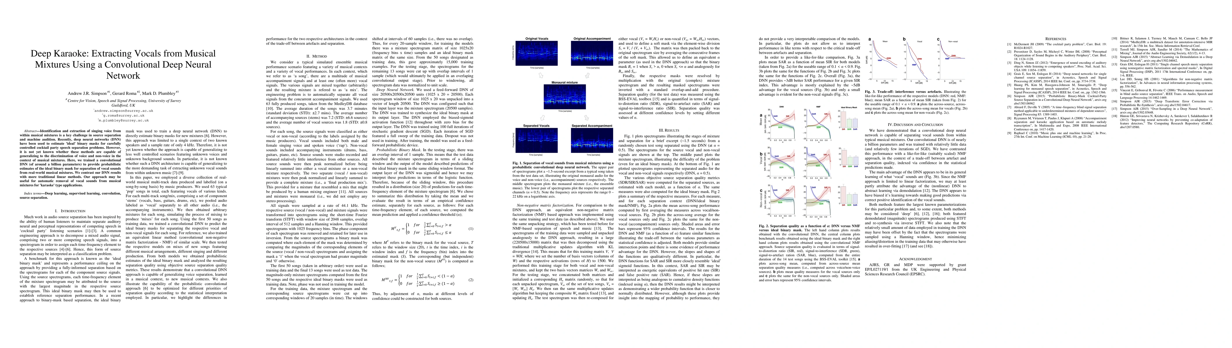This paper presents a convolutional deep neural network trained to extract vocals from musical mixtures, contrasting its performance with traditional linear methods. The DNN aims to generalize voice discrimination in real-world music, potentially enabling automatic karaoke-style vocal removal.