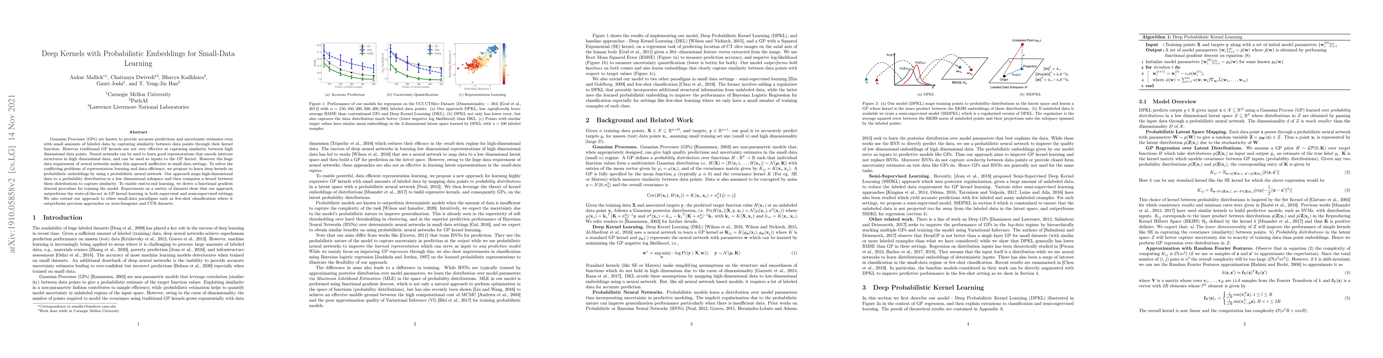 Gaussian Processes (GPs) are known to provide accurate predictions and uncertainty estimates even with small amounts of labeled data by capturing similarity between data points through their kernel function. However traditional GP kernels are not very effective at capturing similarity between high dimensional data points. Neural networks can be used to learn good representations that encode intricate structures in high dimensional data, and can be used as inputs to the GP kernel. However the huge data requirement of neural networks makes this approach ineffective in small data settings. To solves the conflicting problems of representation learning and data efficiency, we propose to learn deep kernels on probabilistic embeddings by using a probabilistic neural network. Our approach maps high-dimensional data to a probability distribution in a low dimensional subspace and then computes a kernel between these distributions to capture similarity. To enable end-to-end learning, we derive a functional gradient descent procedure for training the model. Experiments on a variety of datasets show that our approach outperforms the state-of-the-art in GP kernel learning in both supervised and semi-supervised settings. We also extend our approach to other small-data paradigms such as few-shot classification where it outperforms previous approaches on mini-Imagenet and CUB datasets.