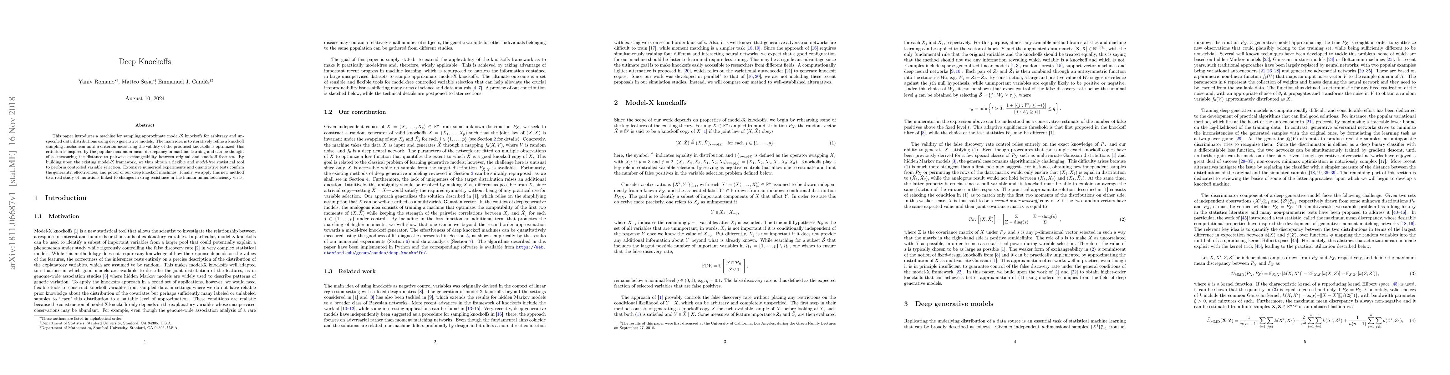 This paper introduces a machine for sampling approximate model-X knockoffs for arbitrary and unspecified data distributions using deep generative models. The main idea is to iteratively refine a knockoff sampling mechanism until a criterion measuring the validity of the produced knockoffs is optimized; this criterion is inspired by the popular maximum mean discrepancy in machine learning and can be thought of as measuring the distance to pairwise exchangeability between original and knockoff features. By building upon the existing model-X framework, we thus obtain a flexible and model-free statistical tool to perform controlled variable selection. Extensive numerical experiments and quantitative tests confirm the generality, effectiveness, and power of our deep knockoff machines. Finally, we apply this new method to a real study of mutations linked to changes in drug resistance in the human immunodeficiency virus.