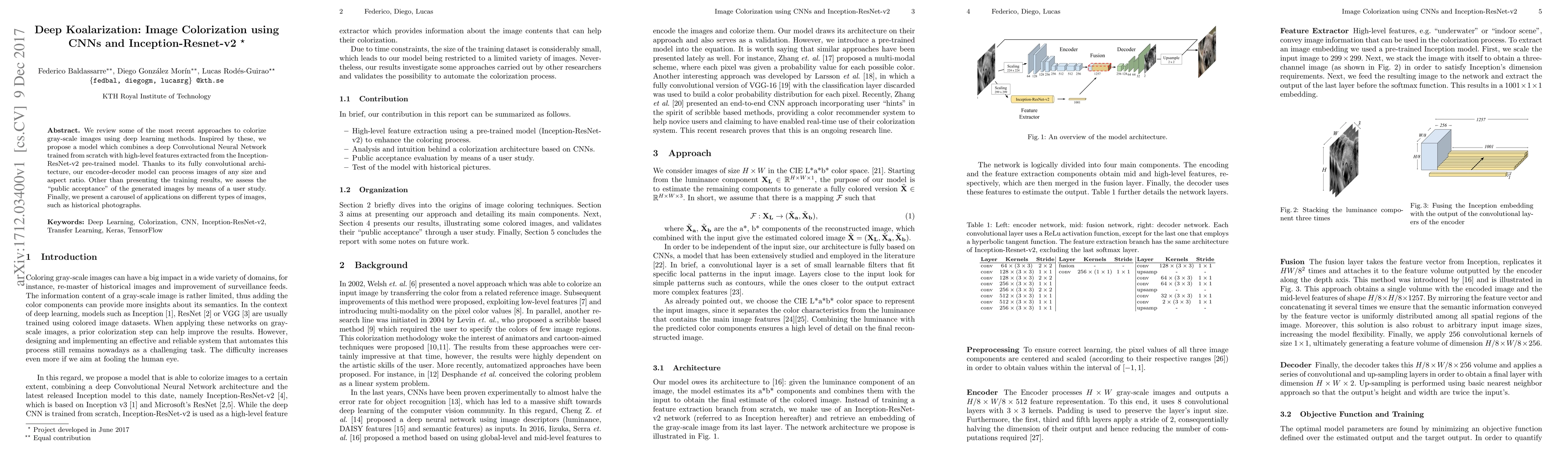 We review some of the most recent approaches to colorize gray-scale images using deep learning methods. Inspired by these, we propose a model which combines a deep Convolutional Neural Network trained from scratch with high-level features extracted from the Inception-ResNet-v2 pre-trained model. Thanks to its fully convolutional architecture, our encoder-decoder model can process images of any size and aspect ratio. Other than presenting the training results, we assess the "public acceptance" of the generated images by means of a user study. Finally, we present a carousel of applications on different types of images, such as historical photographs.