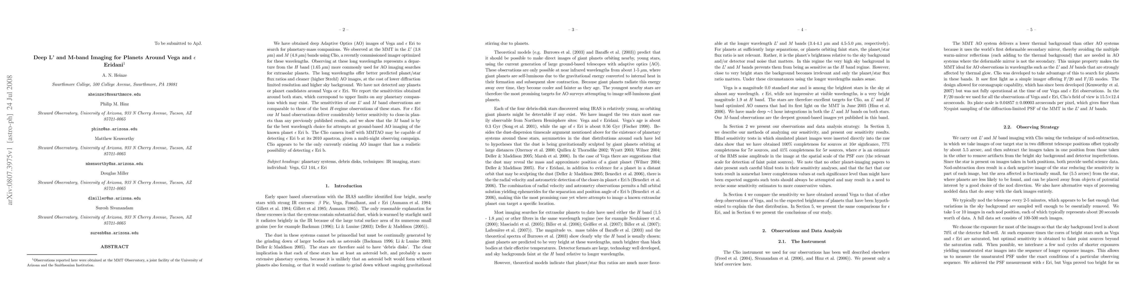 This study utilized deep Adaptive Optics imaging at L' (3.8 micron) and M (4.8 micron) bands to search for planets around Vega and epsilon Eridani, finding no candidates. The long wavelengths provide better planet/star flux ratios and cleaner images, though with lower resolution and higher background noise compared to the more common H band.