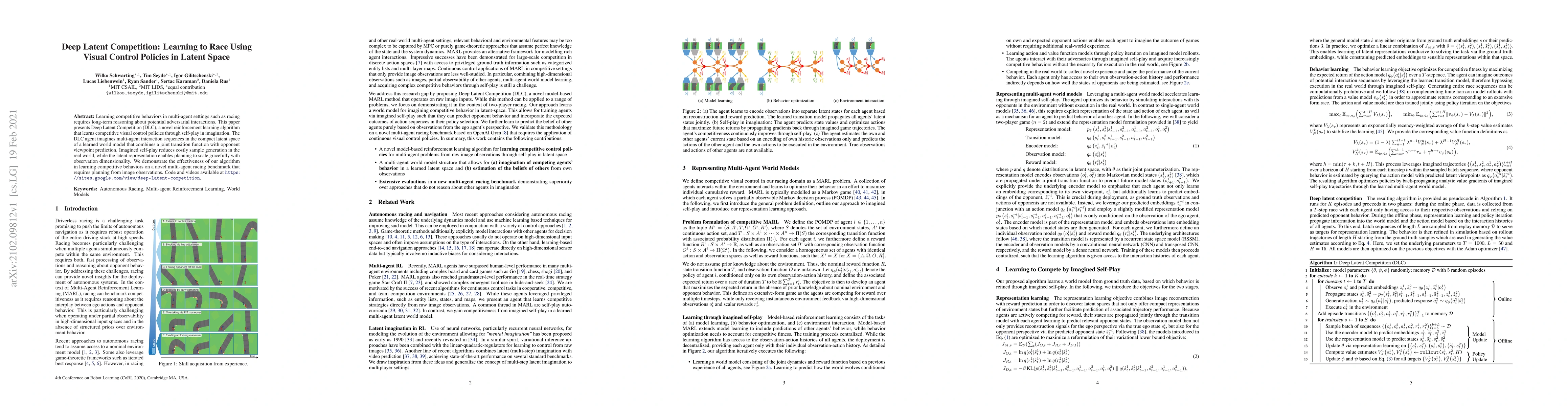 This paper introduces Deep Latent Competition (DLC), a reinforcement learning algorithm for learning competitive behaviors in multi-agent racing through self-play in a latent space. The DLC agent uses imagined multi-agent interactions to reduce real-world sample costs and scales effectively with high-dimensional observations.