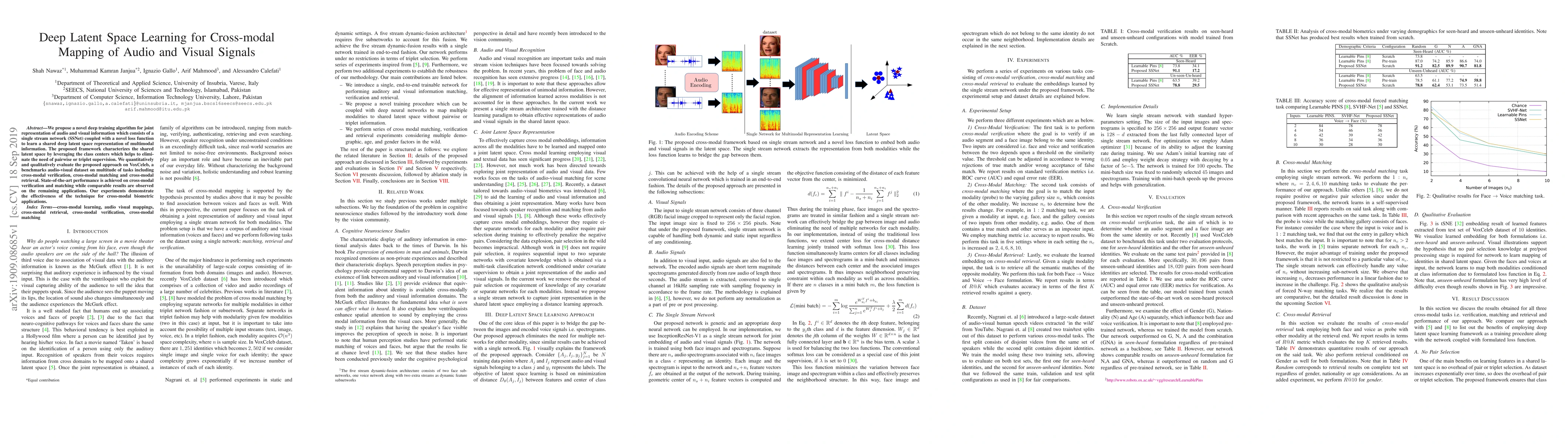 The paper proposes a deep training algorithm utilizing a single stream network (SSNet) with a novel loss function to create a shared latent space for representing audio and visual data. The approach achieves state-of-the-art results in cross-modal verification and matching on VoxCeleb, demonstrating its effectiveness for cross-modal biometric applications.