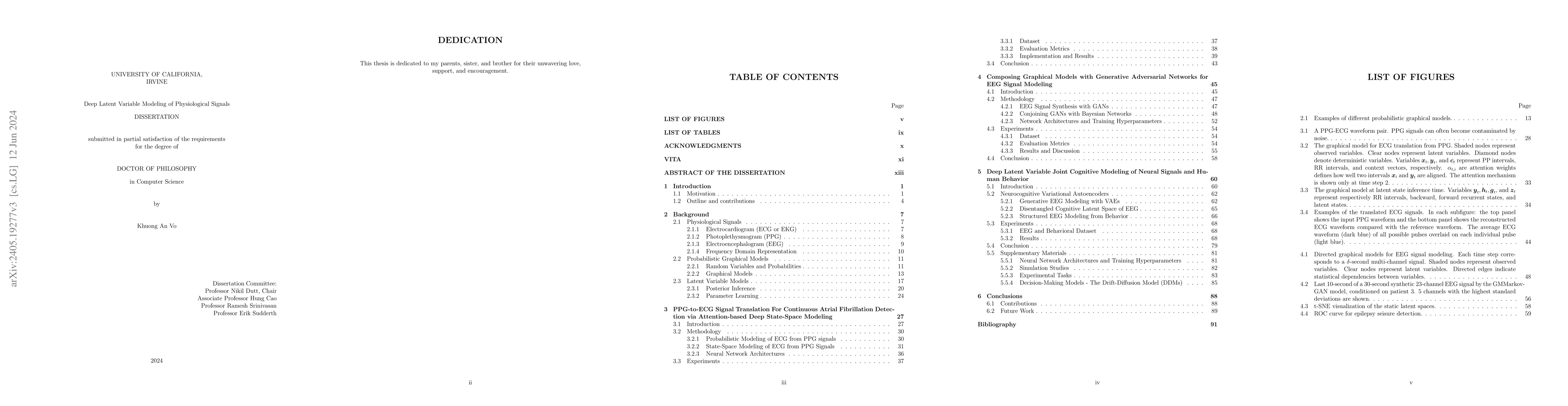 A deep latent variable model is a powerful method for capturing complex distributions. These models assume that underlying structures, but unobserved, are present within the data. In this dissertation, we explore high-dimensional problems related to physiological monitoring using latent variable models. First, we present a novel deep state-space model to generate electrical waveforms of the heart using optically obtained signals as inputs. This can bring about clinical diagnoses of heart disease via simple assessment through wearable devices. Second, we present a brain signal modeling scheme that combines the strengths of probabilistic graphical models and deep adversarial learning. The structured representations can provide interpretability and encode inductive biases to reduce the data complexity of neural oscillations. The efficacy of the learned representations is further studied in epilepsy seizure detection formulated as an unsupervised learning problem. Third, we propose a framework for the joint modeling of physiological measures and behavior. Existing methods to combine multiple sources of brain data provided are limited. Direct analysis of the relationship between different types of physiological measures usually does not involve behavioral data. Our method can identify the unique and shared contributions of brain regions to behavior and can be used to discover new functions of brain regions. The success of these innovative computational methods would allow the translation of biomarker findings across species and provide insight into neurocognitive analysis in numerous biological studies and clinical diagnoses, as well as emerging consumer applications.
