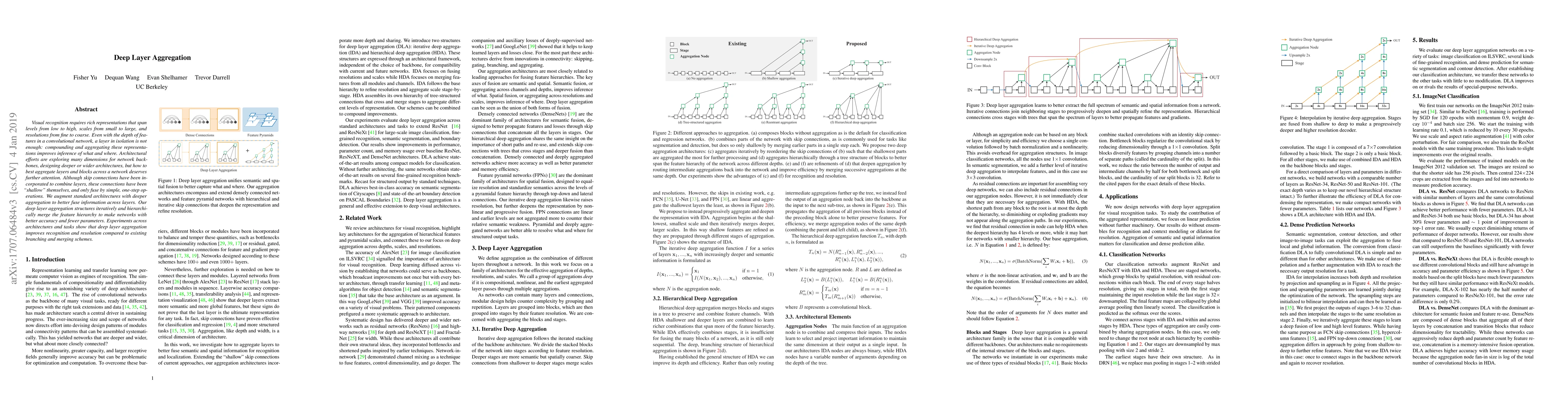 This paper proposes deep layer aggregation to iteratively merge feature hierarchies in convolutional networks, enhancing both accuracy and efficiency. Experimental results demonstrate improved visual recognition performance and reduced parameter count compared to traditional merging methods.