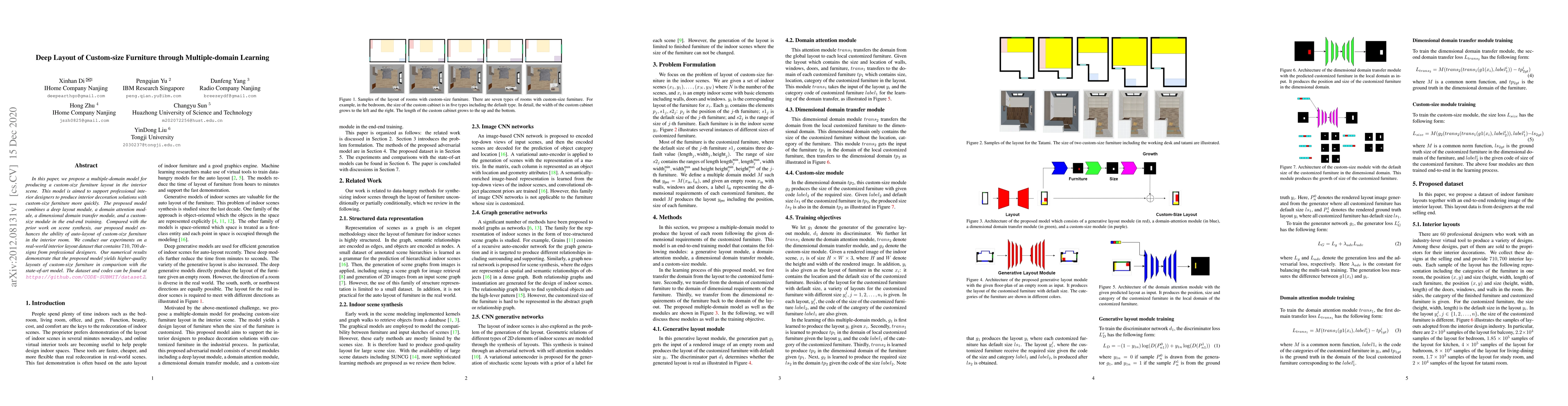 This paper introduces a multiple-domain model for generating custom-size furniture layouts in interior scenes, aiming to assist interior designers. The model, incorporating a deep layout module, domain attention, dimensional domain transfer, and custom-size module, outperforms existing models in auto-layout of custom-size furniture, as demonstrated through experiments on a large dataset of 710,700 professional designs.