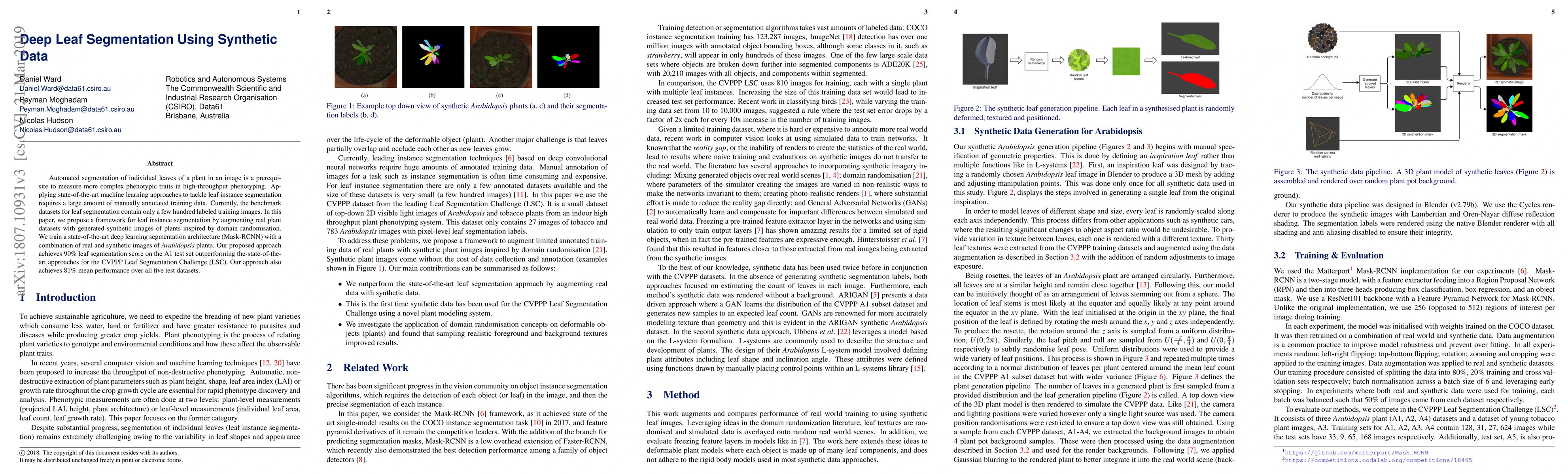 This paper proposes a framework for leaf instance segmentation using a combination of real and synthetic images generated via domain randomisation. The approach trains a Mask-RCNN model, achieving 90% segmentation accuracy on the A1 test set and 81% mean performance across five test datasets, outperforming existing methods.