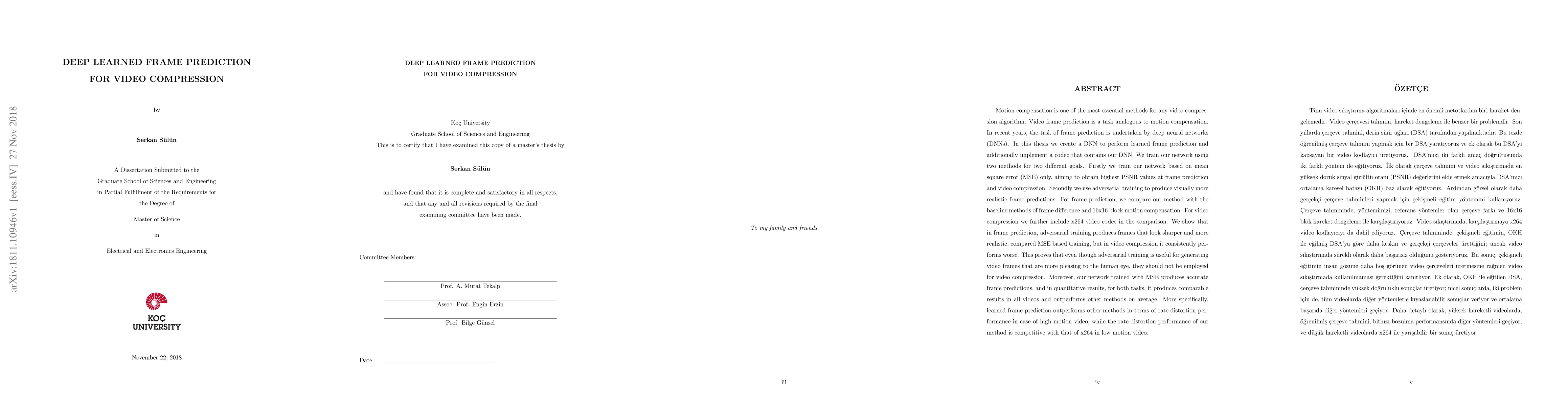 This paper develops a deep neural network for learned frame prediction in video compression, comparing it to traditional methods. The network trained with mean square error achieves higher PSNR values, while adversarial training produces more visually realistic frames, though it performs worse in compression. The MSE-trained network shows superior rate-distortion performance for high motion videos and competitive results with x264 for low motion videos.