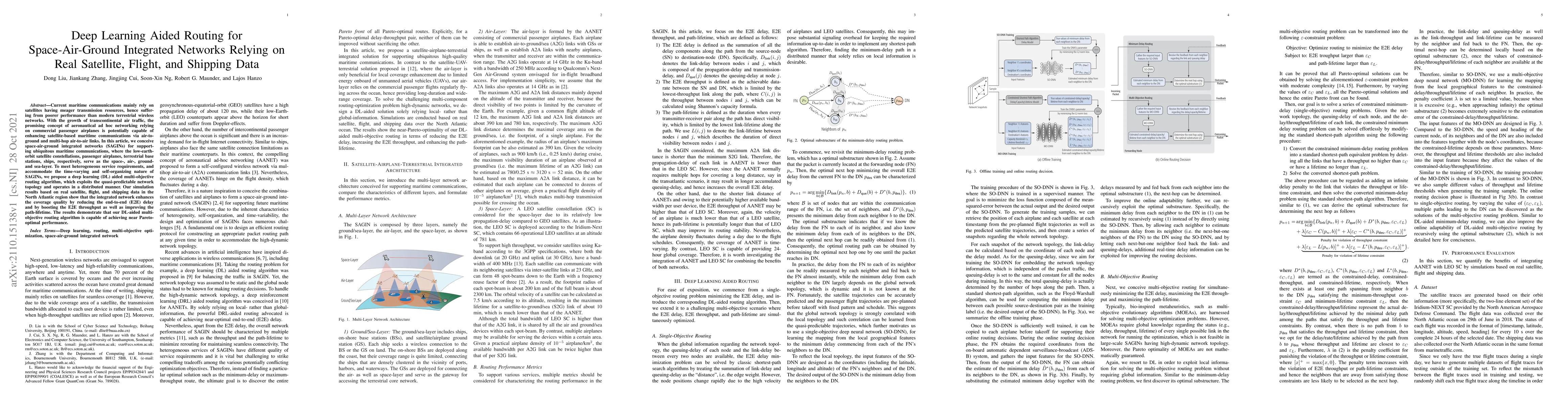 This paper proposes a deep learning-aided routing algorithm for space-air-ground integrated networks (SAGINs) to enhance maritime communications by integrating satellite, air, and ground layers. The algorithm achieves near Pareto-optimal performance in reducing end-to-end delay and boosting throughput while improving path-lifetime, based on real maritime, flight, and satellite data.