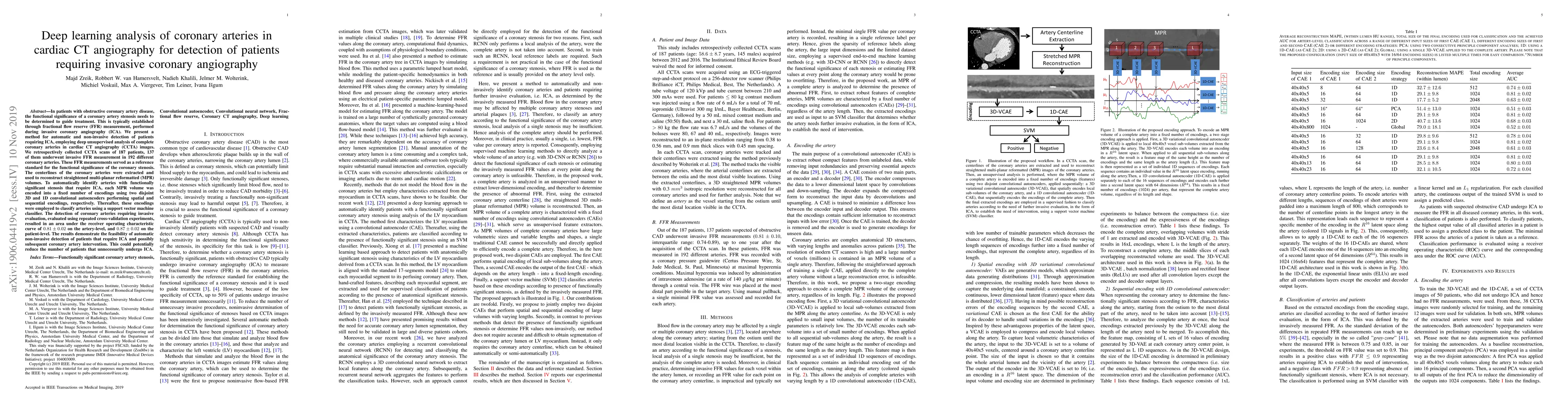 In patients with obstructive coronary artery disease, the functional significance of a coronary artery stenosis needs to be determined to guide treatment. This is typically established through fractional flow reserve (FFR) measurement, performed during invasive coronary angiography (ICA). We present a method for automatic and non-invasive detection of patients requiring ICA, employing deep unsupervised analysis of complete coronary arteries in cardiac CT angiography (CCTA) images. We retrospectively collected CCTA scans of 187 patients, 137 of them underwent invasive FFR measurement in 192 different coronary arteries. These FFR measurements served as a reference standard for the functional significance of the coronary stenosis. The centerlines of the coronary arteries were extracted and used to reconstruct straightened multi-planar reformatted (MPR) volumes. To automatically identify arteries with functionally significant stenosis that require ICA, each MPR volume was encoded into a fixed number of encodings using two disjoint 3D and 1D convolutional autoencoders performing spatial and sequential encodings, respectively. Thereafter, these encodings were employed to classify arteries using a support vector machine classifier. The detection of coronary arteries requiring invasive evaluation, evaluated using repeated cross-validation experiments, resulted in an area under the receiver operating characteristic curve of $0.81 \pm 0.02$ on the artery-level, and $0.87 \pm 0.02$ on the patient-level. The results demonstrate the feasibility of automatic non-invasive detection of patients that require ICA and possibly subsequent coronary artery intervention. This could potentially reduce the number of patients that unnecessarily undergo ICA.