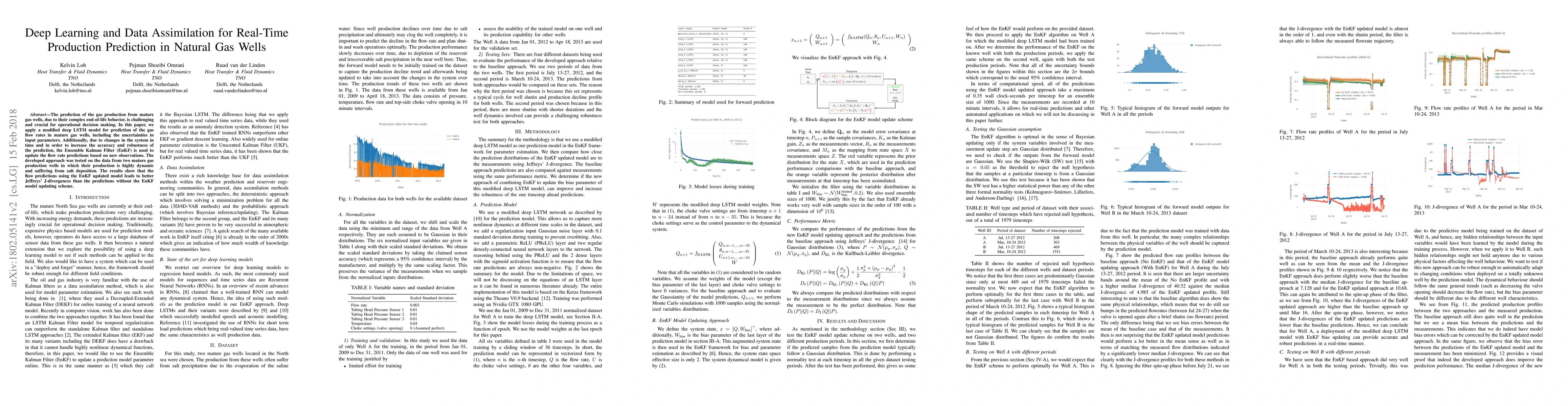The prediction of the gas production from mature gas wells, due to their complex end-of-life behavior, is challenging and crucial for operational decision making. In this paper, we apply a modified deep LSTM model for prediction of the gas flow rates in mature gas wells, including the uncertainties in input parameters. Additionally, due to changes in the system in time and in order to increase the accuracy and robustness of the prediction, the Ensemble Kalman Filter (EnKF) is used to update the flow rate predictions based on new observations. The developed approach was tested on the data from two mature gas production wells in which their production is highly dynamic and suffering from salt deposition. The results show that the flow predictions using the EnKF updated model leads to better Jeffreys' J-divergences than the predictions without the EnKF model updating scheme.