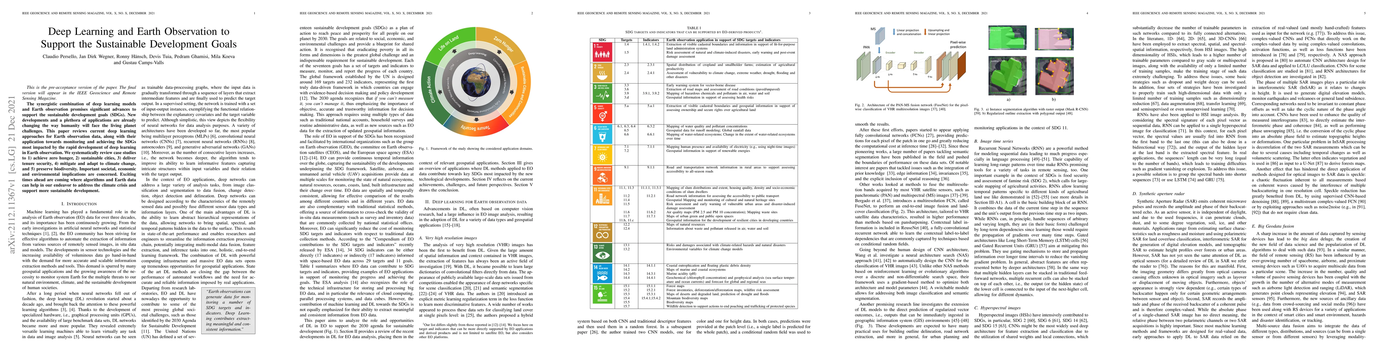 This paper reviews the integration of deep learning and Earth observation to advance sustainable development goals (SDGs), focusing on applications for zero hunger, sustainable cities, tenure security, climate change mitigation, and biodiversity preservation, highlighting significant societal and environmental benefits.