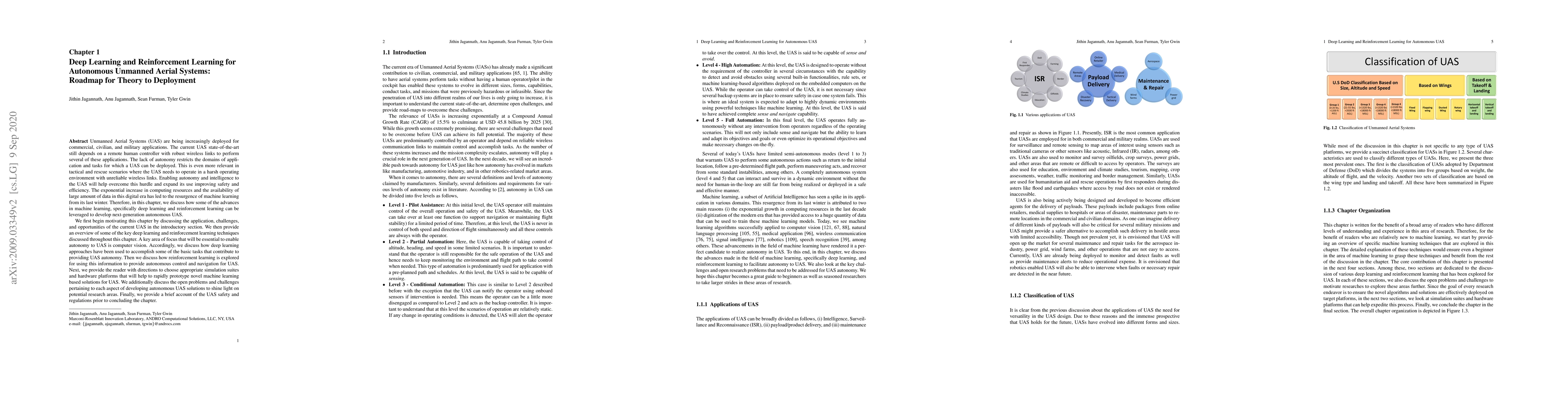 Unmanned Aerial Systems (UAS) are being increasingly deployed for commercial, civilian, and military applications. The current UAS state-of-the-art still depends on a remote human controller with robust wireless links to perform several of these applications. The lack of autonomy restricts the domains of application and tasks for which a UAS can be deployed. Enabling autonomy and intelligence to the UAS will help overcome this hurdle and expand its use improving safety and efficiency. The exponential increase in computing resources and the availability of large amount of data in this digital era has led to the resurgence of machine learning from its last winter. Therefore, in this chapter, we discuss how some of the advances in machine learning, specifically deep learning and reinforcement learning can be leveraged to develop next-generation autonomous UAS. We first begin motivating this chapter by discussing the application, challenges, and opportunities of the current UAS in the introductory section. We then provide an overview of some of the key deep learning and reinforcement learning techniques discussed throughout this chapter. A key area of focus that will be essential to enable autonomy to UAS is computer vision. Accordingly, we discuss how deep learning approaches have been used to accomplish some of the basic tasks that contribute to providing UAS autonomy. Then we discuss how reinforcement learning is explored for using this information to provide autonomous control and navigation for UAS. Next, we provide the reader with directions to choose appropriate simulation suites and hardware platforms that will help to rapidly prototype novel machine learning based solutions for UAS. We additionally discuss the open problems and challenges pertaining to each aspect of developing autonomous UAS solutions to shine light on potential research areas.