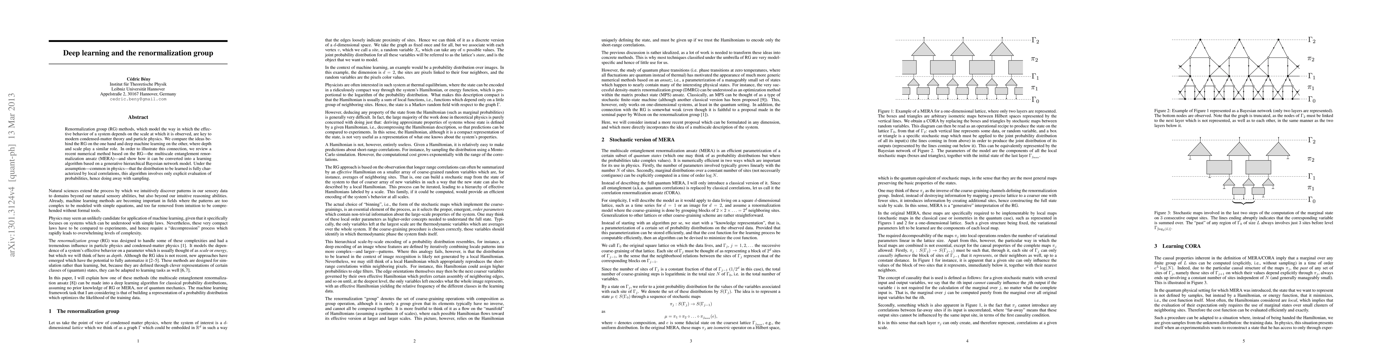 Renormalization group (RG) methods, which model the way in which the effective behavior of a system depends on the scale at which it is observed, are key to modern condensed-matter theory and particle physics. We compare the ideas behind the RG on the one hand and deep machine learning on the other, where depth and scale play a similar role. In order to illustrate this connection, we review a recent numerical method based on the RG---the multiscale entanglement renormalization ansatz (MERA)---and show how it can be converted into a learning algorithm based on a generative hierarchical Bayesian network model. Under the assumption---common in physics---that the distribution to be learned is fully characterized by local correlations, this algorithm involves only explicit evaluation of probabilities, hence doing away with sampling.