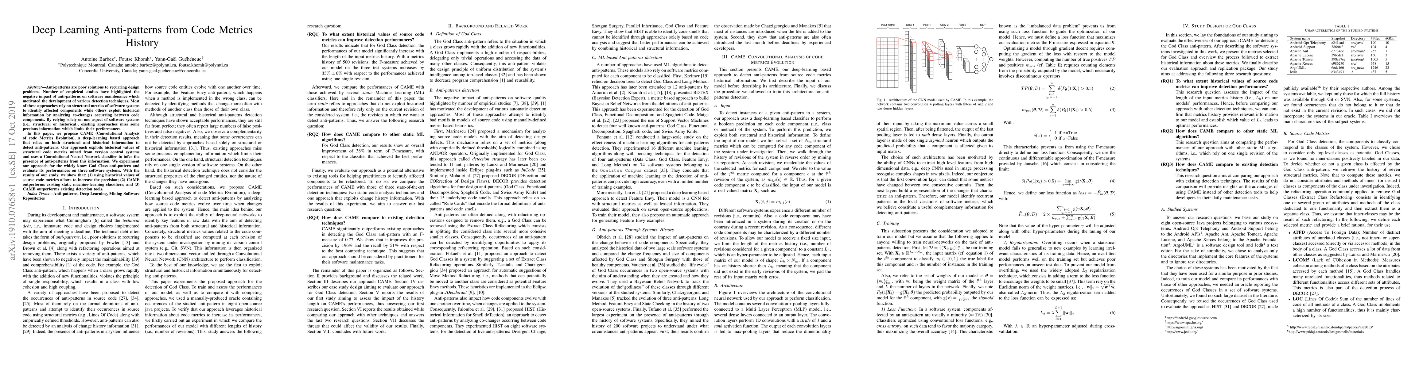 Anti-patterns are poor solutions to recurring design problems. Number of empirical studies have highlighted the negative impact of anti-patterns on software maintenance which motivated the development of various detection techniques. Most of these approaches rely on structural metrics of software systems to identify affected components while others exploit historical information by analyzing co-changes occurring between code components. By relying solely on one aspect of software systems (i.e., structural or historical), existing approaches miss some precious information which limits their performances. In this paper, we propose CAME (Convolutional Analysis of code Metrics Evolution), a deep-learning based approach that relies on both structural and historical information to detect anti-patterns. Our approach exploits historical values of structural code metrics mined from version control systems and uses a Convolutional Neural Network classifier to infer the presence of anti-patterns from this information. We experiment our approach for the widely known God Class anti-pattern and evaluate its performances on three software systems. With the results of our study, we show that: (1) using historical values of source code metrics allows to increase the precision; (2) CAME outperforms existing static machine-learning classifiers; and (3) CAME outperforms existing detection tools.
