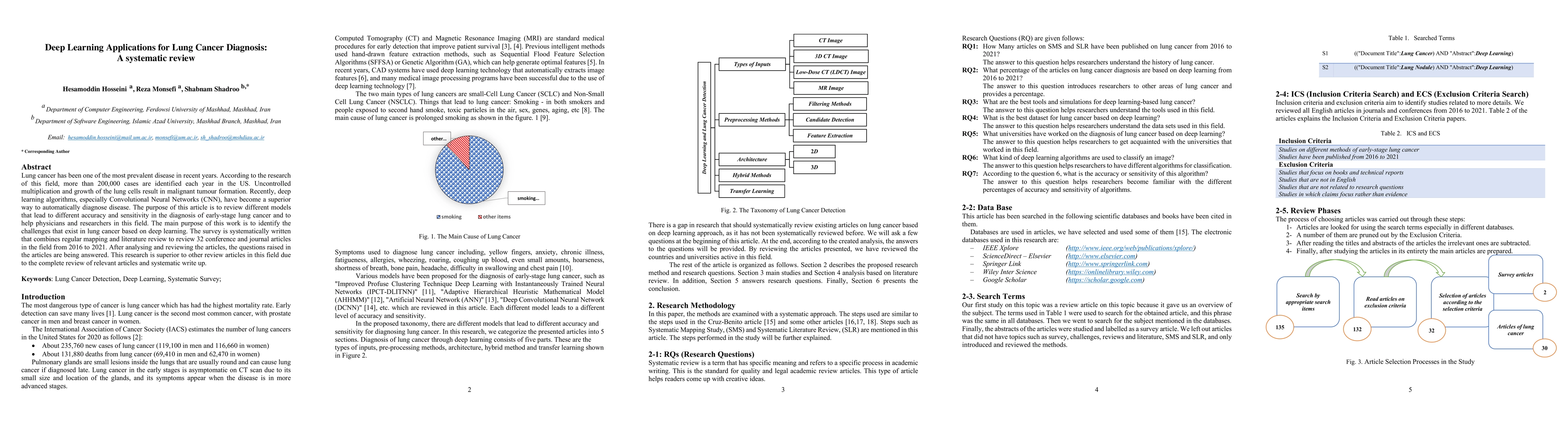 Lung cancer has been one of the most prevalent disease in recent years. According to the research of this field, more than 200,000 cases are identified each year in the US. Uncontrolled multiplication and growth of the lung cells result in malignant tumour formation. Recently, deep learning algorithms, especially Convolutional Neural Networks (CNN), have become a superior way to automatically diagnose disease. The purpose of this article is to review different models that lead to different accuracy and sensitivity in the diagnosis of early-stage lung cancer and to help physicians and researchers in this field. The main purpose of this work is to identify the challenges that exist in lung cancer based on deep learning. The survey is systematically written that combines regular mapping and literature review to review 32 conference and journal articles in the field from 2016 to 2021. After analysing and reviewing the articles, the questions raised in the articles are being answered. This research is superior to other review articles in this field due to the complete review of relevant articles and systematic write up.