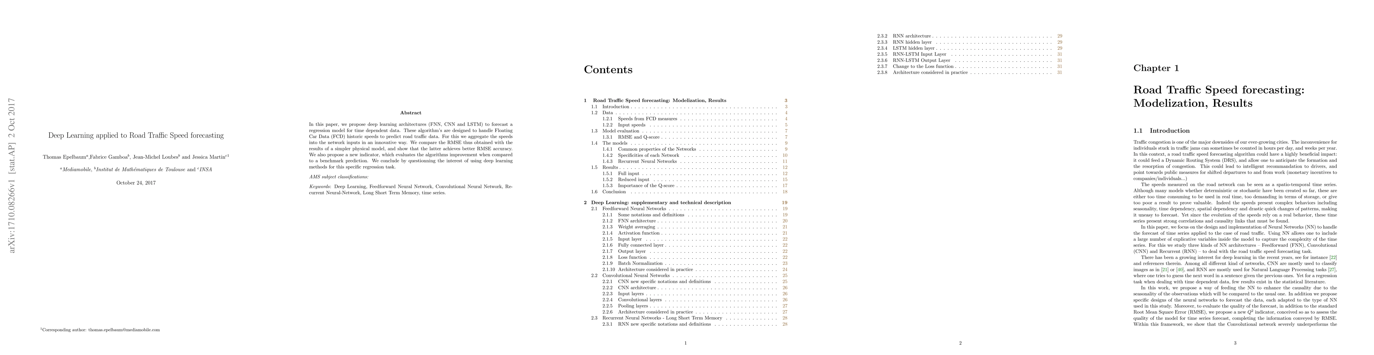 In this paper, we propose deep learning architectures (FNN, CNN and LSTM) to forecast a regression model for time dependent data. These algorithm's are designed to handle Floating Car Data (FCD) historic speeds to predict road traffic data. For this we aggregate the speeds into the network inputs in an innovative way. We compare the RMSE thus obtained with the results of a simpler physical model, and show that the latter achieves better RMSE accuracy. We also propose a new indicator, which evaluates the algorithms improvement when compared to a benchmark prediction. We conclude by questioning the interest of using deep learning methods for this specific regression task.