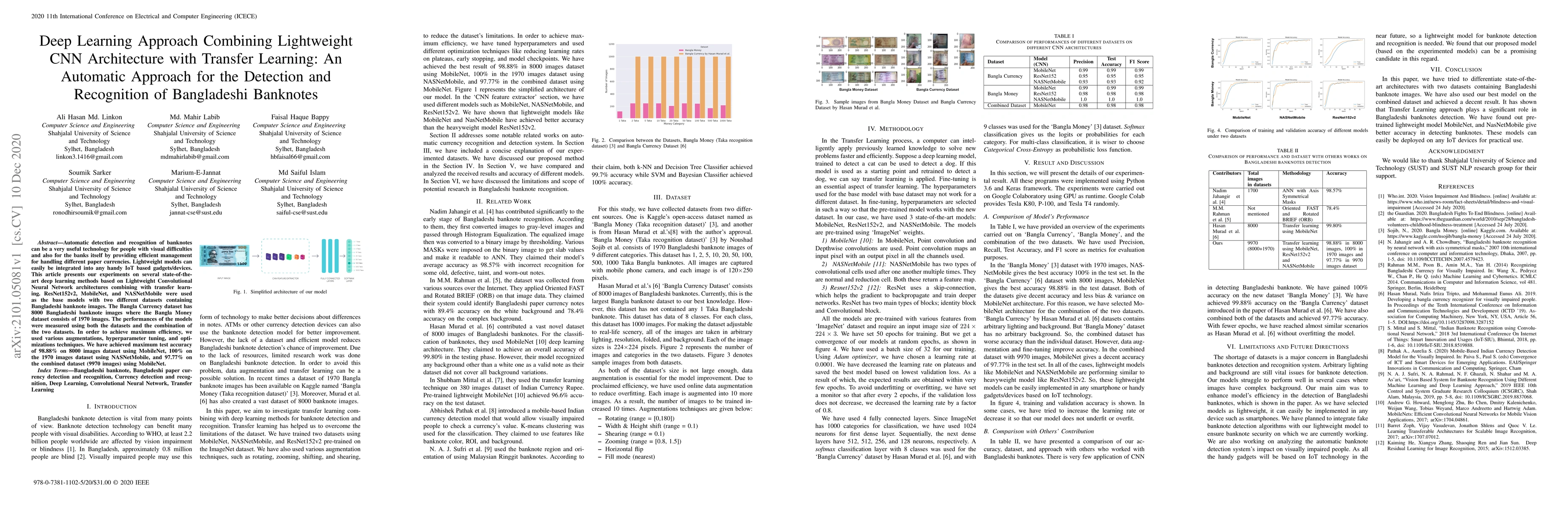 This paper explores lightweight CNN architectures combined with transfer learning for automatic Bangladeshi banknote detection and recognition, achieving high accuracy rates of up to 98.88% using MobileNet on a large dataset and 100% with NASNetMobile on a smaller dataset. The study emphasizes the potential for efficient integration into IoT devices.