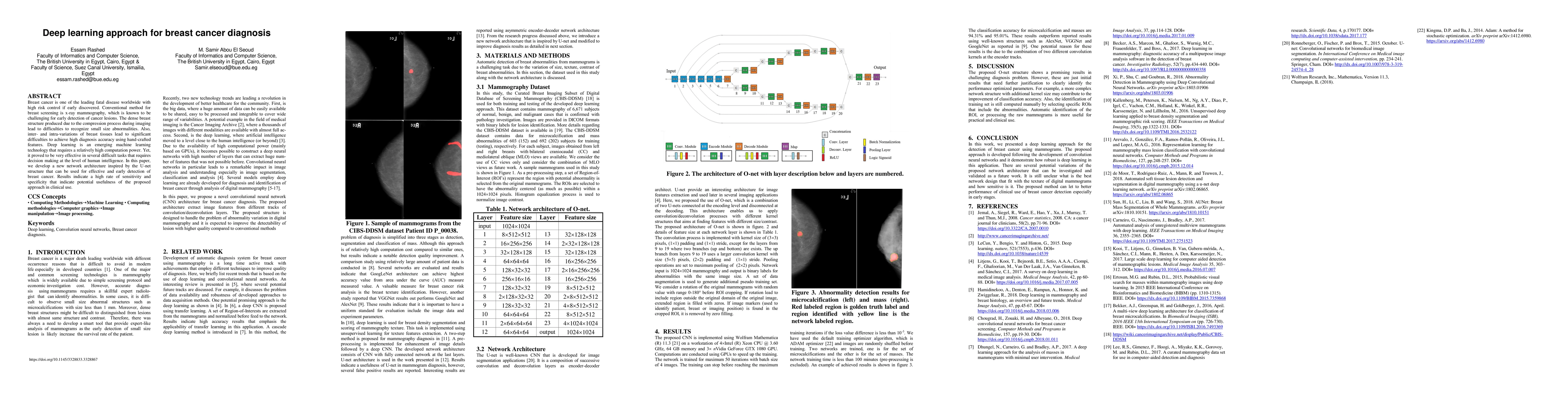 Breast cancer is one of the leading fatal disease worldwide with high risk control if early discovered. Conventional method for breast screening is x-ray mammography, which is known to be challenging for early detection of cancer lesions. The dense breast structure produced due to the compression process during imaging lead to difficulties to recognize small size abnormalities. Also, inter- and intra-variations of breast tissues lead to significant difficulties to achieve high diagnosis accuracy using hand-crafted features. Deep learning is an emerging machine learning technology that requires a relatively high computation power. Yet, it proved to be very effective in several difficult tasks that requires decision making at the level of human intelligence. In this paper, we develop a new network architecture inspired by the U-net structure that can be used for effective and early detection of breast cancer. Results indicate a high rate of sensitivity and specificity that indicate potential usefulness of the proposed approach in clinical use.