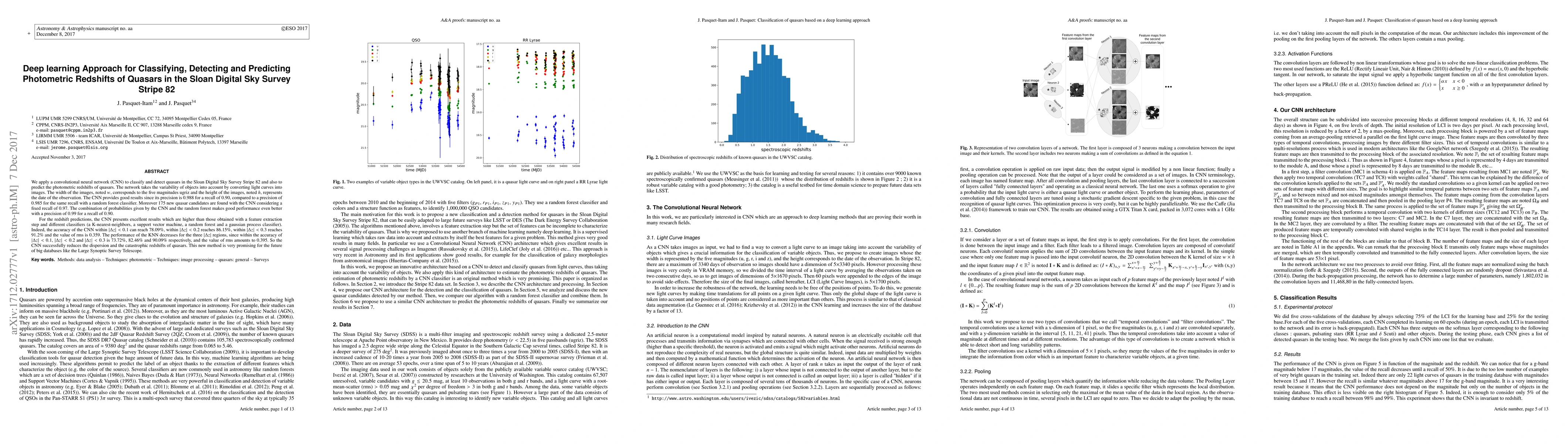 We apply a convolutional neural network (CNN) to classify and detect quasars in the Sloan Digital Sky Survey Stripe 82 and also to predict the photometric redshifts of quasars. The network takes the variability of objects into account by converting light curves into images. The width of the images, noted w, corresponds to the five magnitudes ugriz and the height of the images, noted h, represents the date of the observation. The CNN provides good results since its precision is 0.988 for a recall of 0.90, compared to a precision of 0.985 for the same recall with a random forest classifier. Moreover 175 new quasar candidates are found with the CNN considering a fixed recall of 0.97. The combination of probabilities given by the CNN and the random forest makes good performance even better with a precision of 0.99 for a recall of 0.90. For the redshift predictions, the CNN presents excellent results which are higher than those obtained with a feature extraction step and different classifiers (a K-nearest-neighbors, a support vector machine, a random forest and a gaussian process classifier). Indeed, the accuracy of the CNN within |\Delta z|<0.1 can reach 78.09%, within |\Delta z|<0.2 reaches 86.15%, within |\Delta z|<0.3 reaches 91.2% and the value of rms is 0.359. The performance of the KNN decreases for the three |\Delta z| regions, since within the accuracy of |\Delta z|<0.1, |\Delta z|<0.2 and |\Delta z|<0.3 is 73.72%, 82.46% and 90.09% respectively, and the value of rms amounts to 0.395. So the CNN successfully reduces the dispersion and the catastrophic redshifts of quasars. This new method is very promising for the future of big databases like the Large Synoptic Survey Telescope.