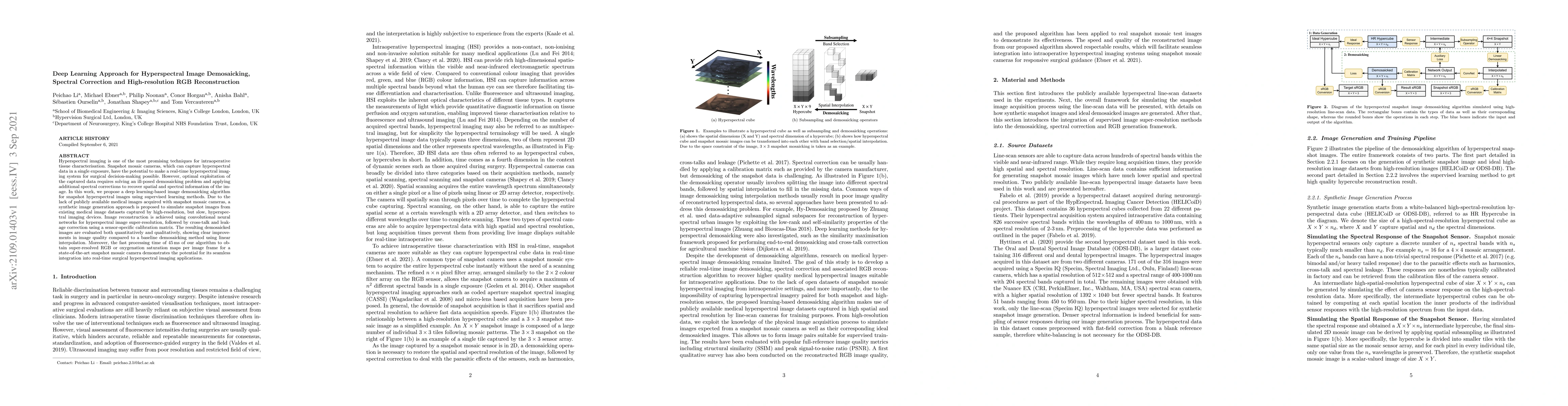 This paper proposes a deep learning-based method for hyperspectral image demosaicking, spectral correction, and high-resolution RGB reconstruction using snapshot mosaic cameras. The method employs convolutional neural networks to achieve super-resolution and correct spectral distortions, demonstrating significant improvements in image quality and real-time processing suitable for surgical applications.