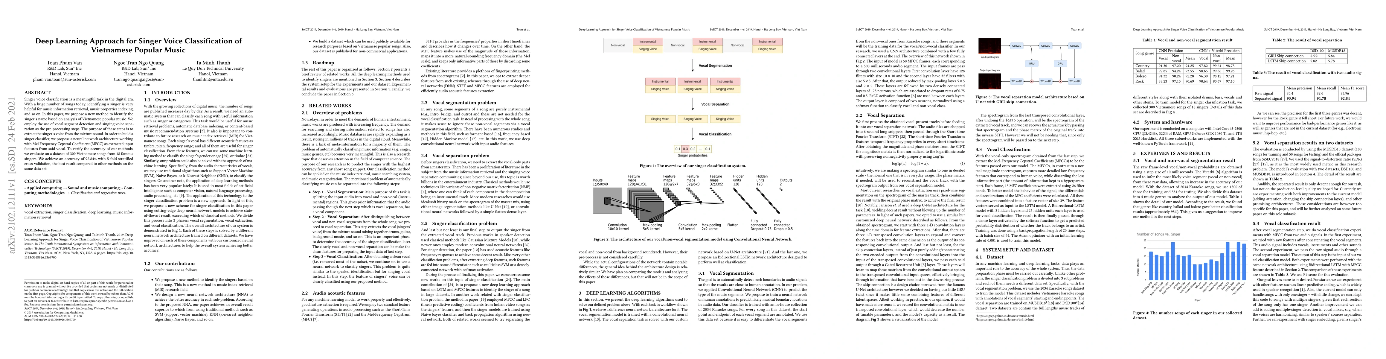 This paper proposes a deep learning approach to classify singers in Vietnamese popular music with 92.84% accuracy. It uses vocal segment detection and Mel Frequency Cepstral Coefficient as input features for a neural network classifier.