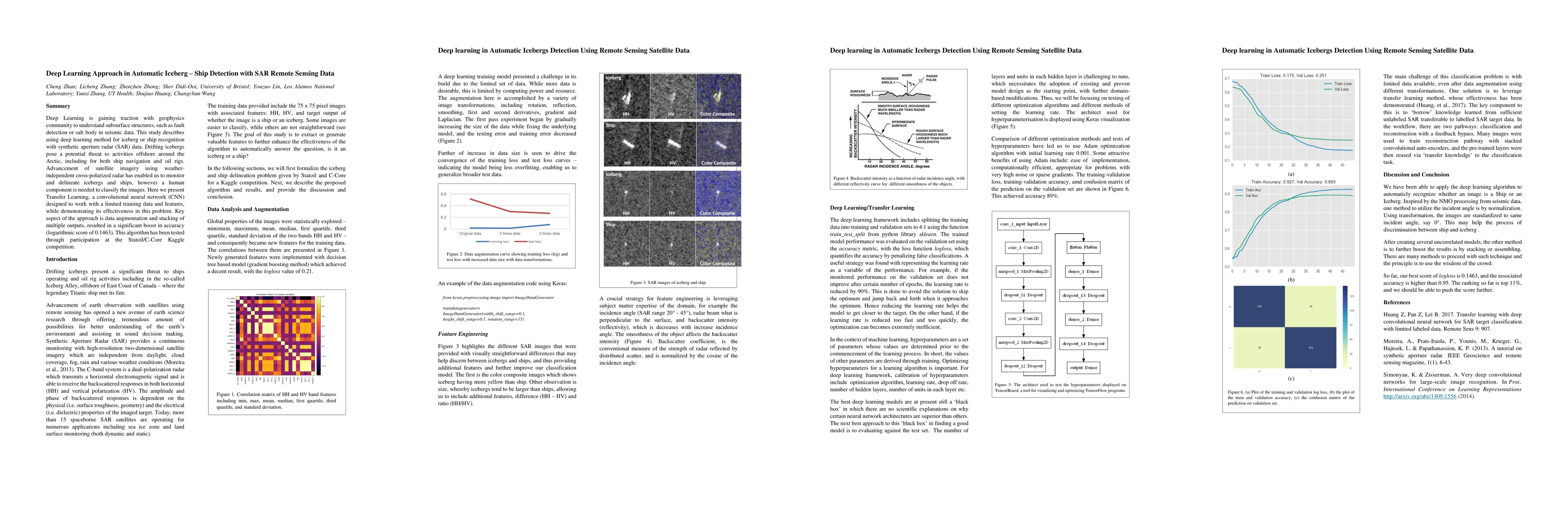 Deep Learning is gaining traction with geophysics community to understand subsurface structures, such as fault detection or salt body in seismic data. This study describes using deep learning method for iceberg or ship recognition with synthetic aperture radar (SAR) data. Drifting icebergs pose a potential threat to activities offshore around the Arctic, including for both ship navigation and oil rigs. Advancement of satellite imagery using weather-independent cross-polarized radar has enabled us to monitor and delineate icebergs and ships, however a human component is needed to classify the images. Here we present Transfer Learning, a convolutional neural network (CNN) designed to work with a limited training data and features, while demonstrating its effectiveness in this problem. Key aspect of the approach is data augmentation and stacking of multiple outputs, resulted in a significant boost in accuracy (logarithmic score of 0.1463). This algorithm has been tested through participation at the Statoil/C-Core Kaggle competition.