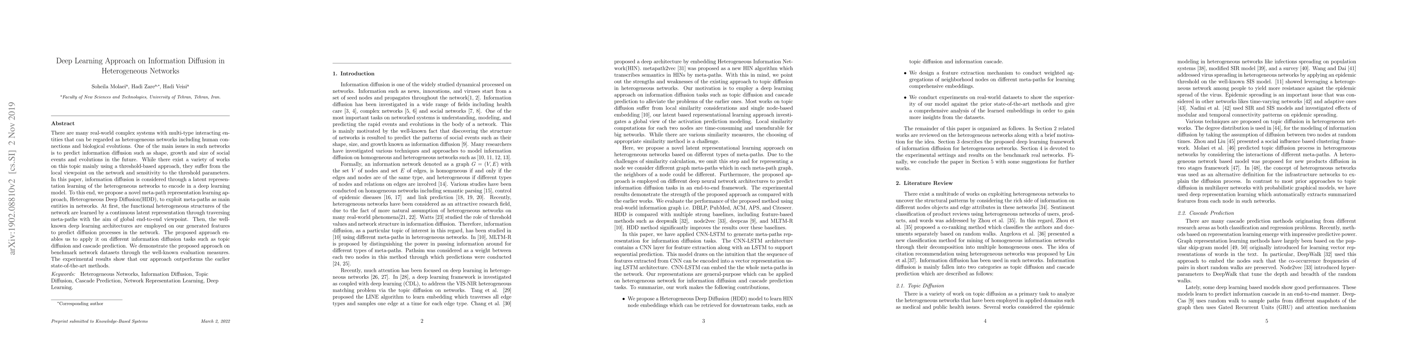 This paper proposes a novel deep learning approach, Heterogeneous Deep Diffusion (HDD), to predict information diffusion in heterogeneous networks using meta-path representation learning. The HDD model learns global network structures and outperforms existing threshold-based methods, demonstrating superior performance on benchmark datasets.