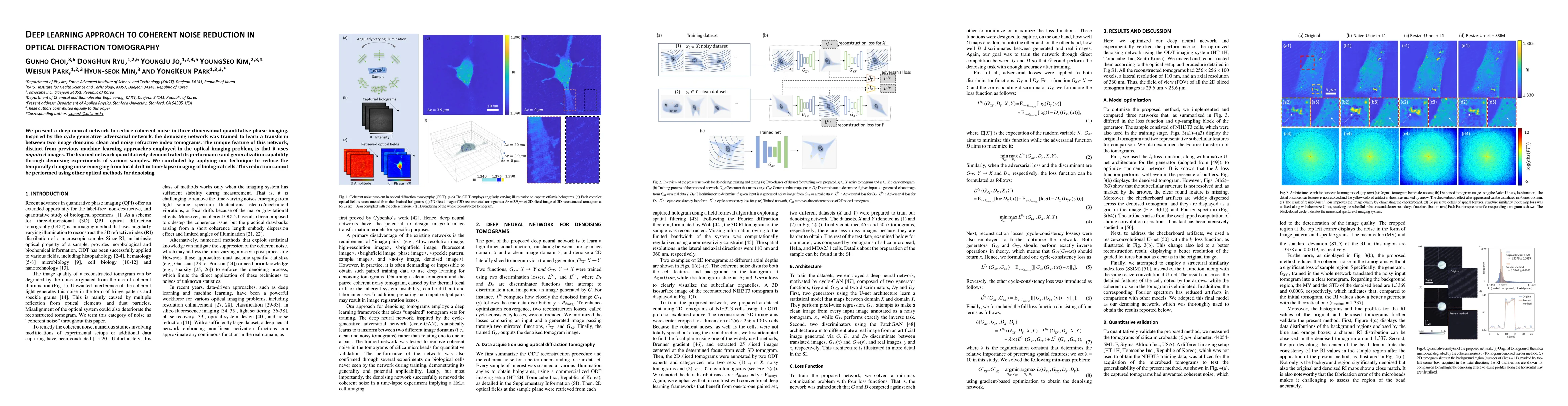 We present a deep neural network to reduce coherent noise in three-dimensional quantitative phase imaging. Inspired by the cycle generative adversarial network, the denoising network was trained to learn a transform between two image domains: clean and noisy refractive index tomograms. The unique feature of this network, distinct from previous machine learning approaches employed in the optical imaging problem, is that it uses unpaired images. The learned network quantitatively demonstrated its performance and generalization capability through denoising experiments of various samples. We concluded by applying our technique to reduce the temporally changing noise emerging from focal drift in time-lapse imaging of biological cells. This reduction cannot be performed using other optical methods for denoising.