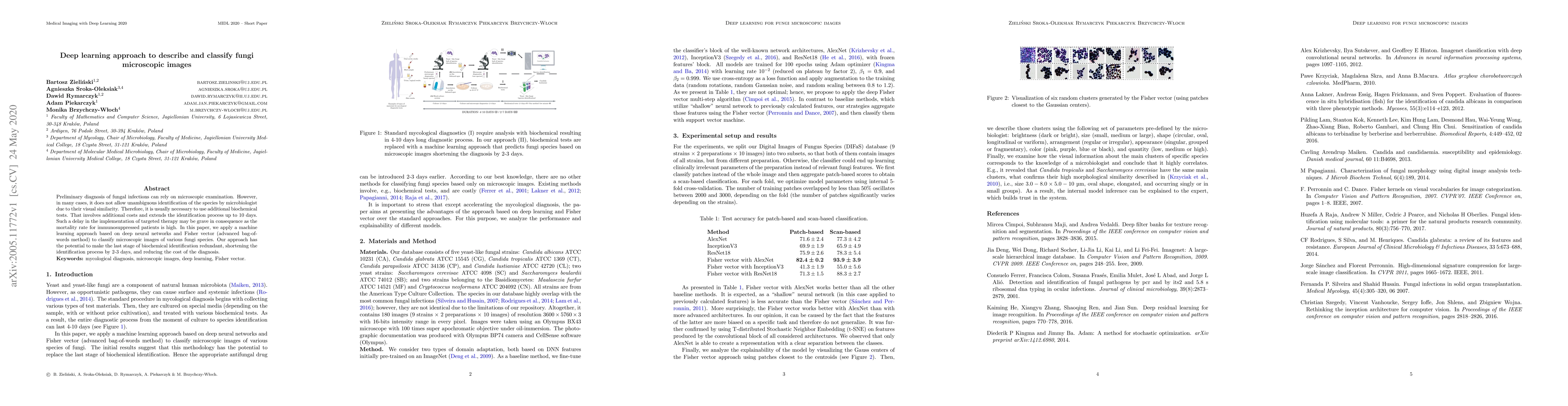 Preliminary diagnosis of fungal infections can rely on microscopic examination. However, in many cases, it does not allow unambiguous identification of the species by microbiologist due to their visual similarity. Therefore, it is usually necessary to use additional biochemical tests. That involves additional costs and extends the identification process up to 10 days. Such a delay in the implementation of targeted therapy may be grave in consequence as the mortality rate for immunosuppressed patients is high. In this paper, we apply a machine learning approach based on deep neural networks and Fisher Vector (advanced bag-of-words method) to classify microscopic images of various fungi species. Our approach has the potential to make the last stage of biochemical identification redundant, shortening the identification process by 2-3 days, and reducing the cost of the diagnosis.