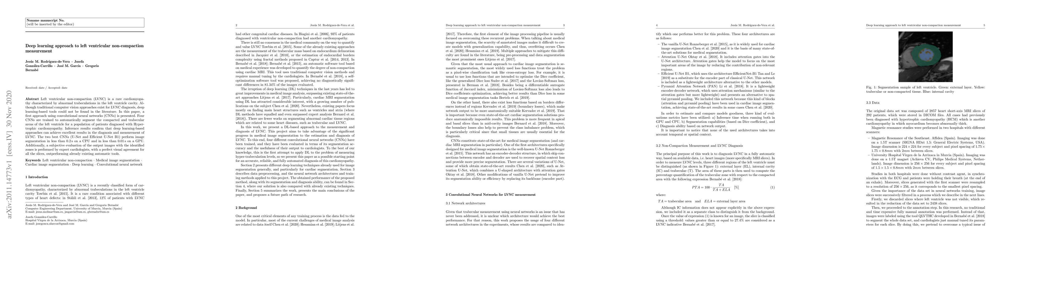 Left ventricular non-compaction (LVNC) is a rare cardiomyopathy characterized by abnormal trabeculations in the left ventricle cavity. Although traditional computer vision approaches exist for LVNC diagnosis, deep learning-based tools could not be found in the literature. In this paper, a first approach using convolutional neural networks (CNNs) is presented. Four CNNs are trained to automatically segment the compacted and trabecular areas of the left ventricle for a population of patients diagnosed with Hypertrophic cardiomyopathy. Inference results confirm that deep learning-based approaches can achieve excellent results in the diagnosis and measurement of LVNC. The two best CNNs (U-Net and Efficient U-Net B1) perform image segmentation in less than 0.2 s on a CPU and in less than 0.01 s on a GPU. Additionally, a subjective evaluation of the output images with the identified zones is performed by expert cardiologists, with a perfect visual agreement for all the slices, outperforming already existing automatic tools.