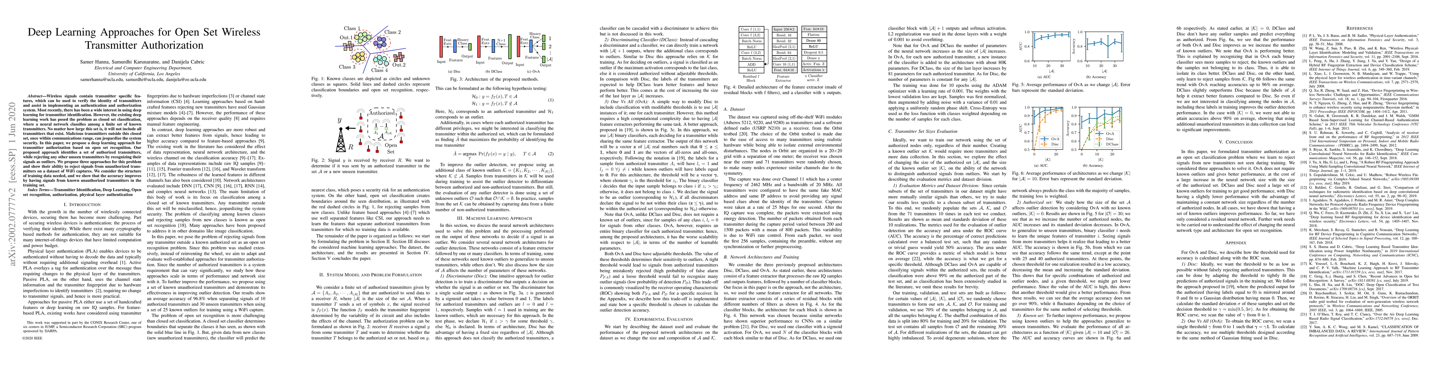 The paper proposes deep learning approaches for open set wireless transmitter authorization, formulating the problem as open set recognition to identify authorized transmitters and reject unseen ones by recognizing their signals as outliers. Three approaches are proposed: Discriminator (Disc), Discriminating Classifier (DClass), and One-Vs-All (OvA). These methods use a feature extractor followed by one or multiple classifiers, with training requiring known outliers for some architectures.