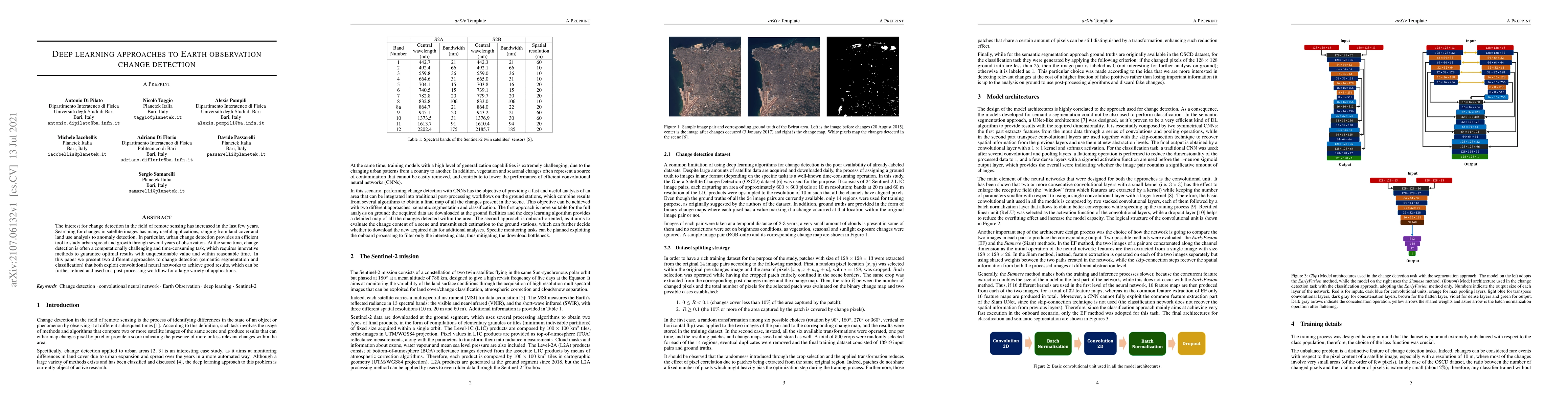 The interest for change detection in the field of remote sensing has increased in the last few years. Searching for changes in satellite images has many useful applications, ranging from land cover and land use analysis to anomaly detection. In particular, urban change detection provides an efficient tool to study urban spread and growth through several years of observation. At the same time, change detection is often a computationally challenging and time-consuming task, which requires innovative methods to guarantee optimal results with unquestionable value and within reasonable time. In this paper we present two different approaches to change detection (semantic segmentation and classification) that both exploit convolutional neural networks to achieve good results, which can be further refined and used in a post-processing workflow for a large variety of applications.