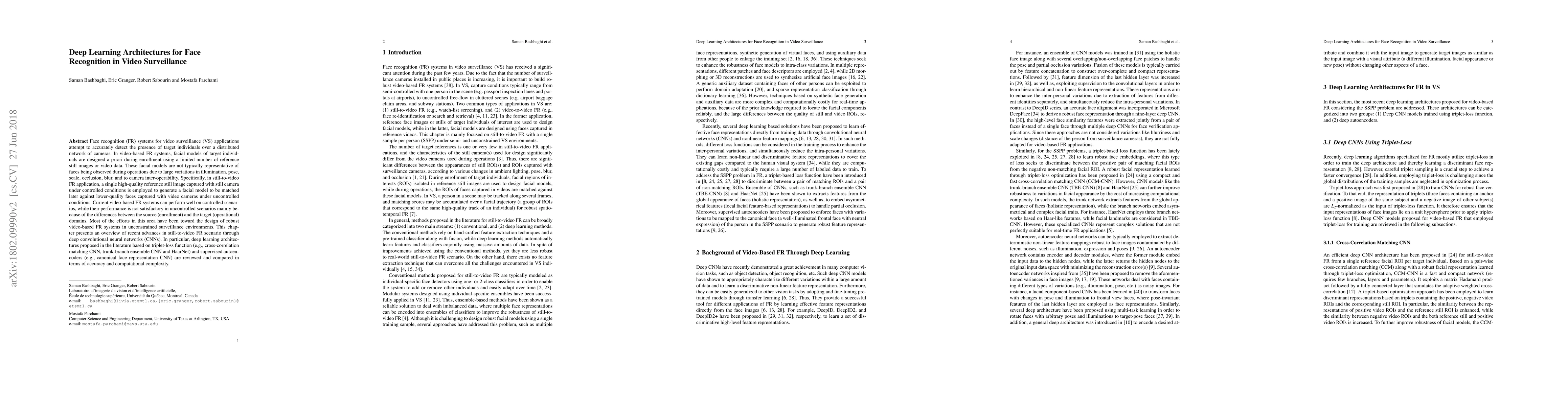 The paper reviews deep learning architectures for face recognition in video surveillance, focusing on triplet-loss functions (Cross-Correlation Matching CNN, Trunk-Branch Ensemble CNN, HaarNet) and supervised autoencoders (Canonical Face Representation CNN).
