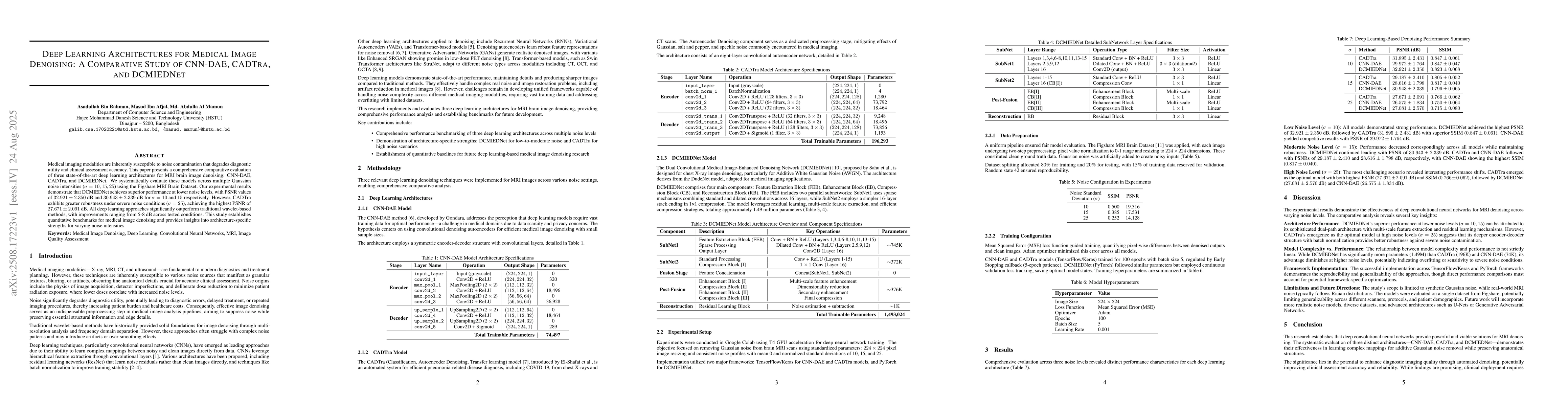 Medical imaging modalities are inherently susceptible to noise contamination that degrades diagnostic utility and clinical assessment accuracy. This paper presents a comprehensive comparative evaluation of three state-of-the-art deep learning architectures for MRI brain image denoising: CNN-DAE, CADTra, and DCMIEDNet. We systematically evaluate these models across multiple Gaussian noise intensities ($\sigma = 10, 15, 25$) using the Figshare MRI Brain Dataset. Our experimental results demonstrate that DCMIEDNet achieves superior performance at lower noise levels, with PSNR values of $32.921 \pm 2.350$ dB and $30.943 \pm 2.339$ dB for $\sigma = 10$ and $15$ respectively. However, CADTra exhibits greater robustness under severe noise conditions ($\sigma = 25$), achieving the highest PSNR of $27.671 \pm 2.091$ dB. All deep learning approaches significantly outperform traditional wavelet-based methods, with improvements ranging from 5-8 dB across tested conditions. This study establishes quantitative benchmarks for medical image denoising and provides insights into architecture-specific strengths for varying noise intensities.
