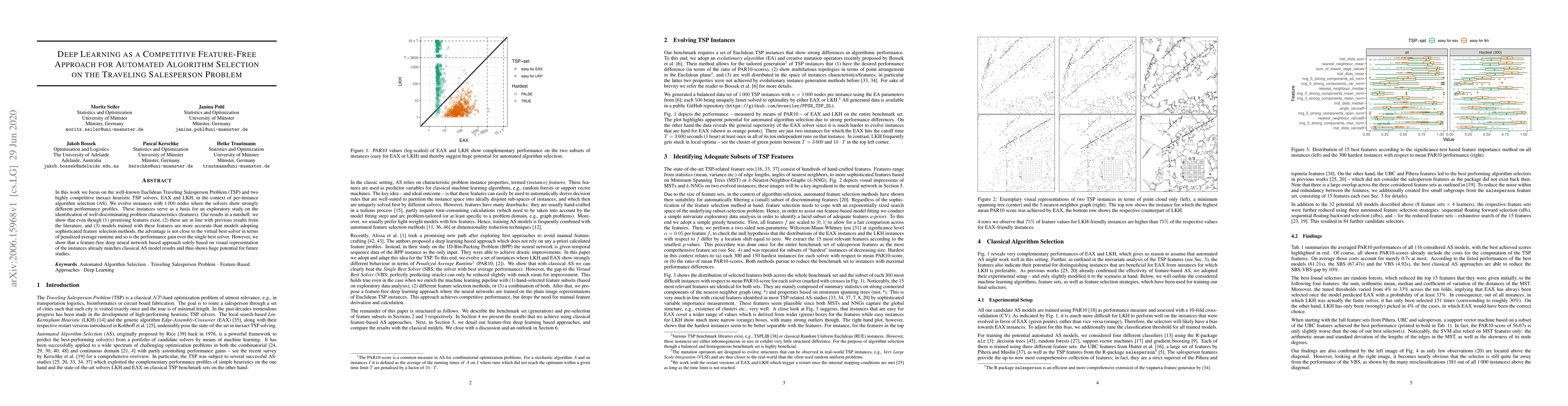 This paper explores automated algorithm selection for the Traveling Salesperson Problem using deep learning without relying on problem-specific features. Despite identifying promising features, the study finds that a feature-free deep neural network approach based on visual representations matches the performance of classical models, indicating significant potential for future research.