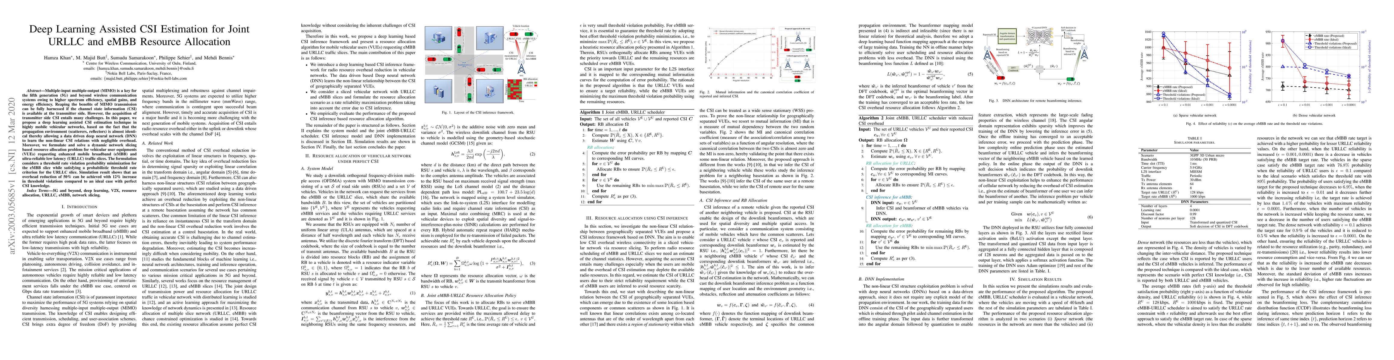 This paper proposes a deep learning technique for estimating channel state information (CSI) in vehicular networks, leveraging identical propagation environments to minimize overhead. It also formulates a resource allocation problem for eMBB and URLLC traffic slices, achieving a 50% overhead reduction with a 12% increase in threshold violations compared to perfect CSI.