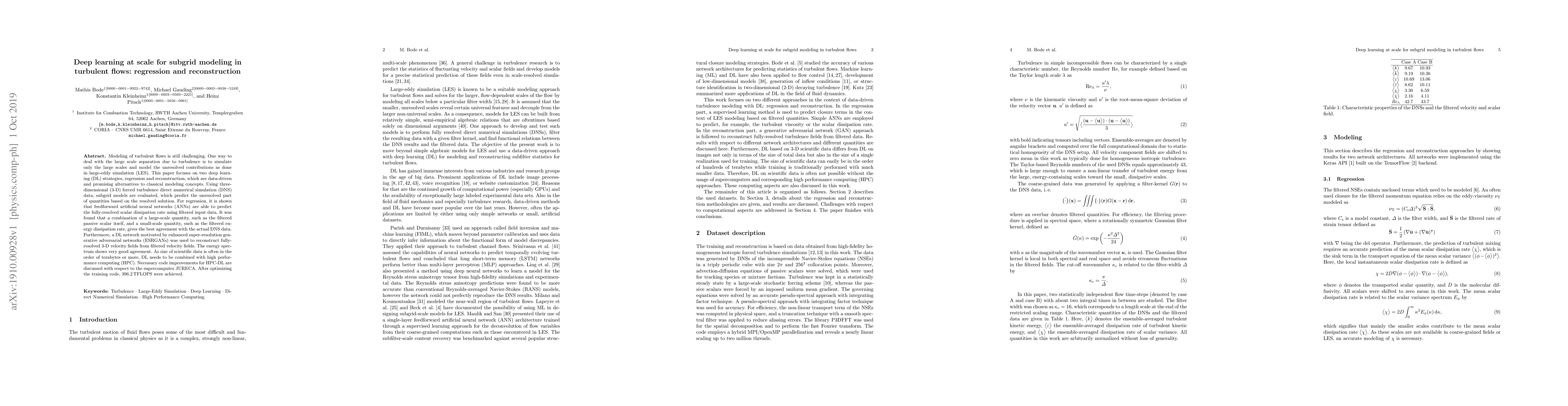 Modeling of turbulent flows is still challenging. One way to deal with the large scale separation due to turbulence is to simulate only the large scales and model the unresolved contributions as done in large-eddy simulation (LES). This paper focuses on two deep learning (DL) strategies, regression and reconstruction, which are data-driven and promising alternatives to classical modeling concepts. Using three-dimensional (3-D) forced turbulence direct numerical simulation (DNS) data, subgrid models are evaluated, which predict the unresolved part of quantities based on the resolved solution. For regression, it is shown that feedforward artificial neural networks (ANNs) are able to predict the fully-resolved scalar dissipation rate using filtered input data. It was found that a combination of a large-scale quantity, such as the filtered passive scalar itself, and a small-scale quantity, such as the filtered energy dissipation rate, gives the best agreement with the actual DNS data. Furthermore, a DL network motivated by enhanced super-resolution generative adversarial networks (ESRGANs) was used to reconstruct fully-resolved 3-D velocity fields from filtered velocity fields. The energy spectrum shows very good agreement. As size of scientific data is often in the order of terabytes or more, DL needs to be combined with high performance computing (HPC). Necessary code improvements for HPC-DL are discussed with respect to the supercomputer JURECA. After optimizing the training code, 396.2 TFLOPS were achieved.