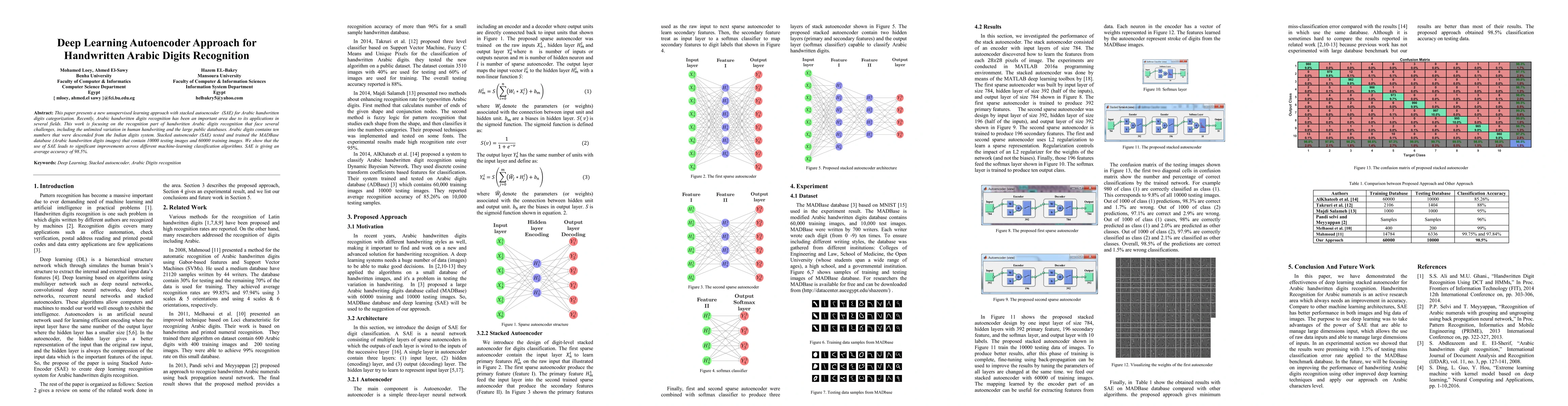 This paper introduces an unsupervised learning method using stacked autoencoders (SAE) for recognizing handwritten Arabic digits, achieving an average accuracy of 98.5% on the MADBase database, demonstrating significant improvements over traditional classification algorithms.