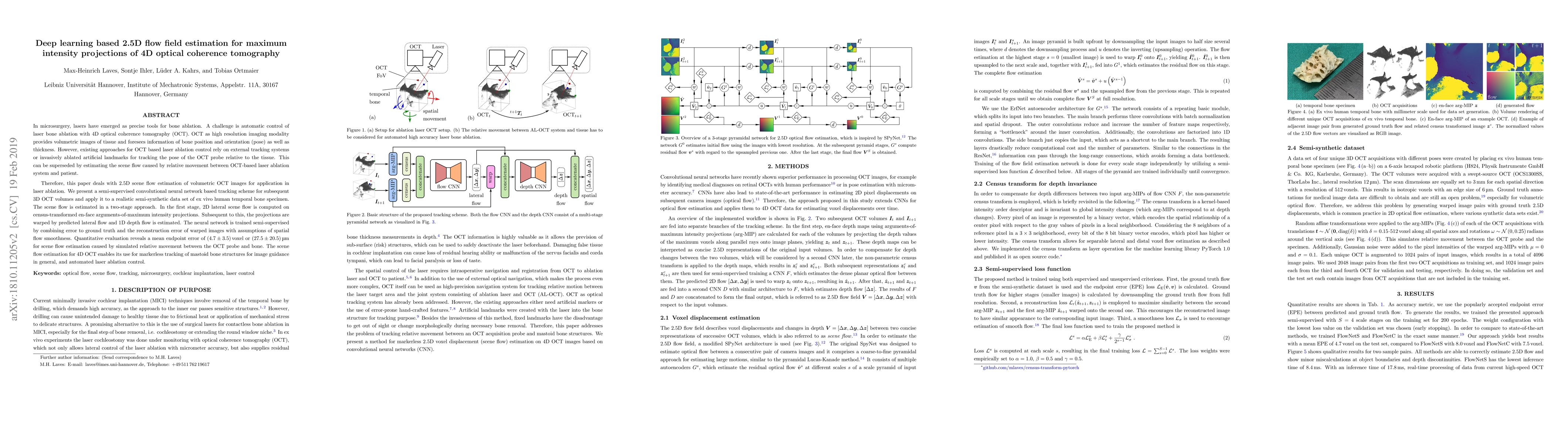 In microsurgery, lasers have emerged as precise tools for bone ablation. A challenge is automatic control of laser bone ablation with 4D optical coherence tomography (OCT). OCT as high resolution imaging modality provides volumetric images of tissue and foresees information of bone position and orientation (pose) as well as thickness. However, existing approaches for OCT based laser ablation control rely on external tracking systems or invasively ablated artificial landmarks for tracking the pose of the OCT probe relative to the tissue. This can be superseded by estimating the scene flow caused by relative movement between OCT-based laser ablation system and patient. Therefore, this paper deals with 2.5D scene flow estimation of volumetric OCT images for application in laser ablation. We present a semi-supervised convolutional neural network based tracking scheme for subsequent 3D OCT volumes and apply it to a realistic semi-synthetic data set of ex vivo human temporal bone specimen. The scene flow is estimated in a two-stage approach. In the first stage, 2D lateral scene flow is computed on census-transformed en-face arguments-of-maximum intensity projections. Subsequent to this, the projections are warped by predicted lateral flow and 1D depth flow is estimated. The neural network is trained semi-supervised by combining error to ground truth and the reconstruction error of warped images with assumptions of spatial flow smoothness. Quantitative evaluation reveals a mean endpoint error of $ (4.7\pm{}3.5) $ voxel or $ 27.5 \pm 20.5 \mu\mathrm{m} $ for scene flow estimation caused by simulated relative movement between the OCT probe and bone. The scene flow estimation for 4D OCT enables its use for markerless tracking of mastoid bone structures for image guidance in general, and automated laser ablation control.