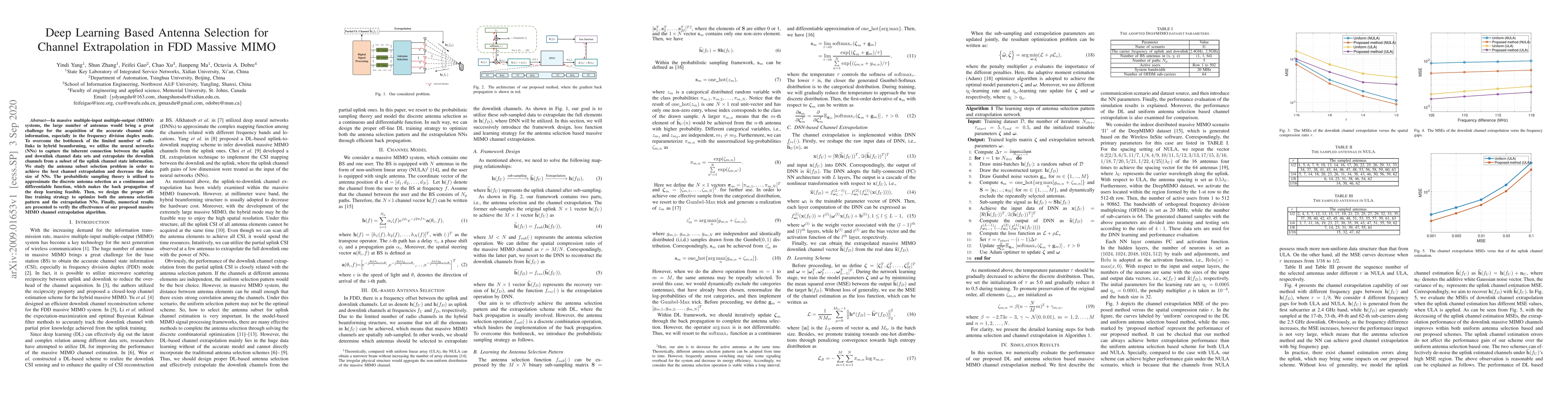This paper proposes a deep learning-based method for antenna selection in massive MIMO systems to improve channel state information acquisition in frequency division duplex mode. It employs neural networks to extrapolate downlink channels from uplink data, optimizing antenna subset selection via probabilistic sampling theory for efficient training.