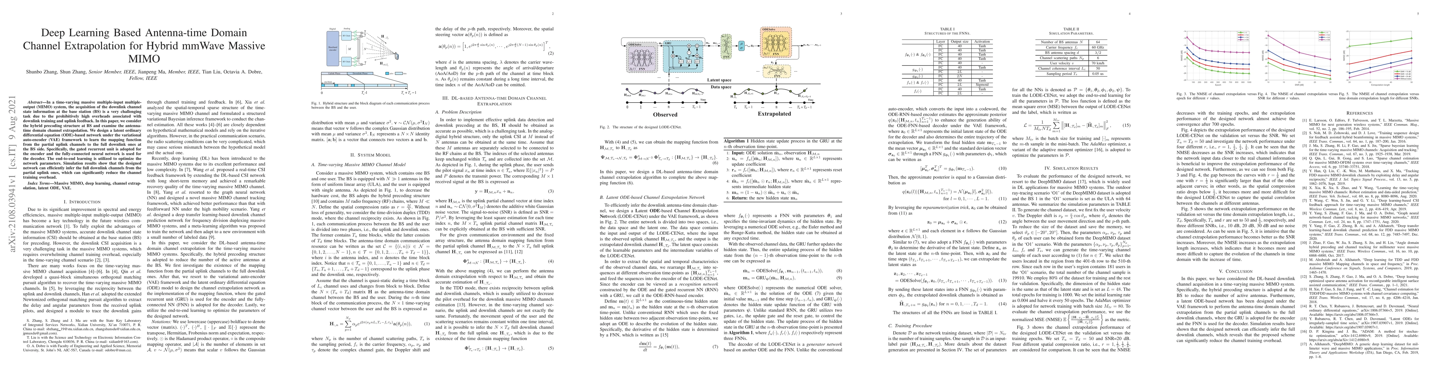 In a time-varying massive multiple-input multipleoutput (MIMO) system, the acquisition of the downlink channel state information at the base station (BS) is a very challenging task due to the prohibitively high overheads associated with downlink training and uplink feedback. In this paper, we consider the hybrid precoding structure at BS and examine the antennatime domain channel extrapolation. We design a latent ordinary differential equation (ODE)-based network under the variational auto-encoder (VAE) framework to learn the mapping function from the partial uplink channels to the full downlink ones at the BS side. Specifically, the gated recurrent unit is adopted for the encoder and the fully-connected neural network is used for the decoder. The end-to-end learning is utilized to optimize the network parameters. Simulation results show that the designed network can efficiently infer the full downlink channels from the partial uplink ones, which can significantly reduce the channel training overhead.