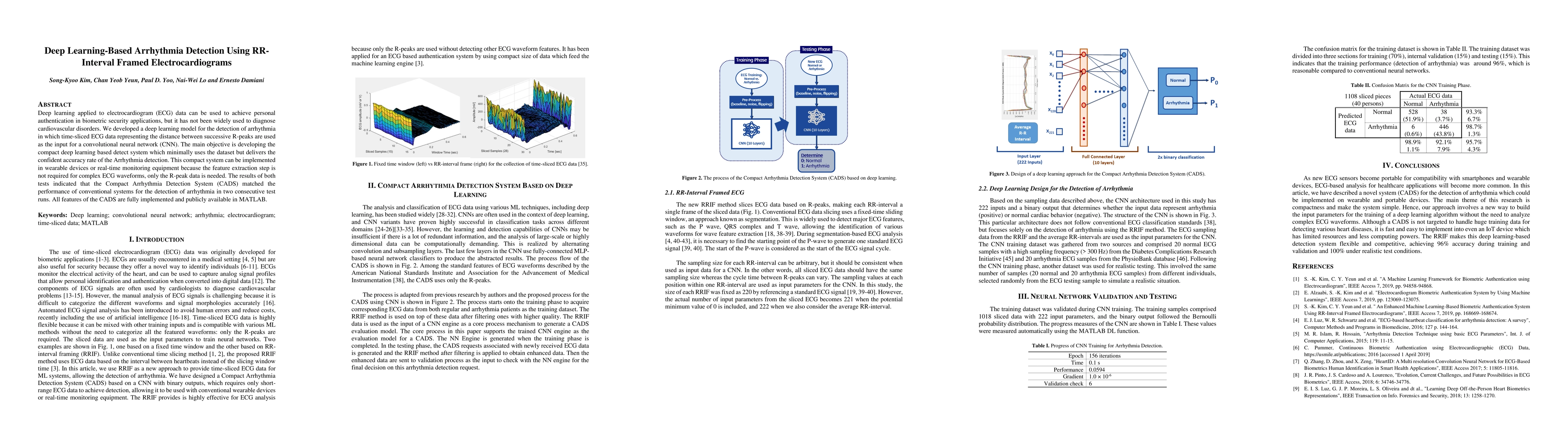 Deep learning applied to electrocardiogram (ECG) data can be used to achieve personal authentication in biometric security applications, but it has not been widely used to diagnose cardiovascular disorders. We developed a deep learning model for the detection of arrhythmia in which time-sliced ECG data representing the distance between successive R-peaks are used as the input for a convolutional neural network (CNN). The main objective is developing the compact deep learning based detect system which minimally uses the dataset but delivers the confident accuracy rate of the Arrhythmia detection. This compact system can be implemented in wearable devices or real-time monitoring equipment because the feature extraction step is not required for complex ECG waveforms, only the R-peak data is needed. The results of both tests indicated that the Compact Arrhythmia Detection System (CADS) matched the performance of conventional systems for the detection of arrhythmia in two consecutive test runs. All features of the CADS are fully implemented and publicly available in MATLAB.