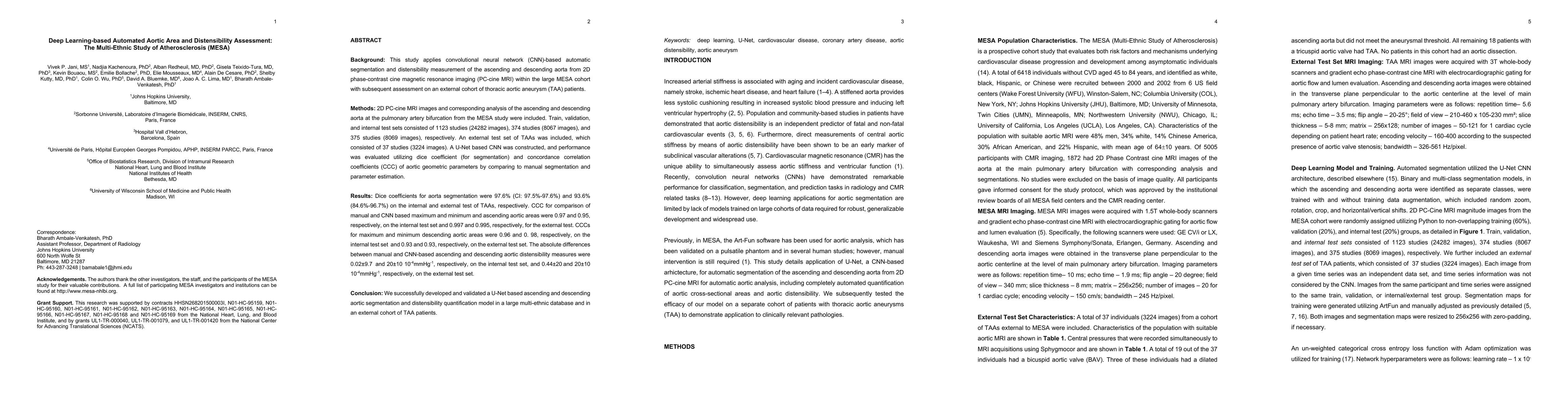 This study developed a U-Net based CNN for automatic segmentation and distensibility measurement of the aorta from 2D PC-cine MRI in the MESA cohort and validated it in an external TAA cohort, achieving high accuracy in both datasets.