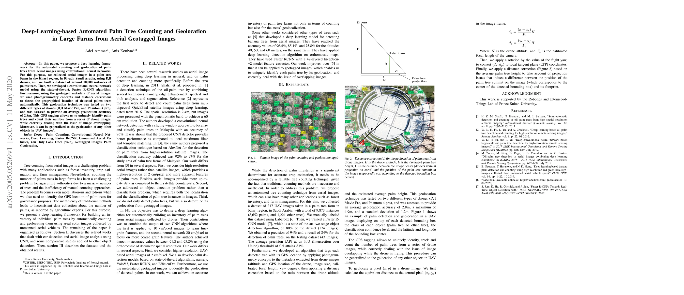 This paper presents a deep learning framework utilizing Faster R-CNN for automated counting and geolocation of palm trees in large farms from aerial images. The geolocation technique, tested on two drones, provides an average accuracy of 2.8m, enabling unique identification and counting of palm trees despite image overlap.