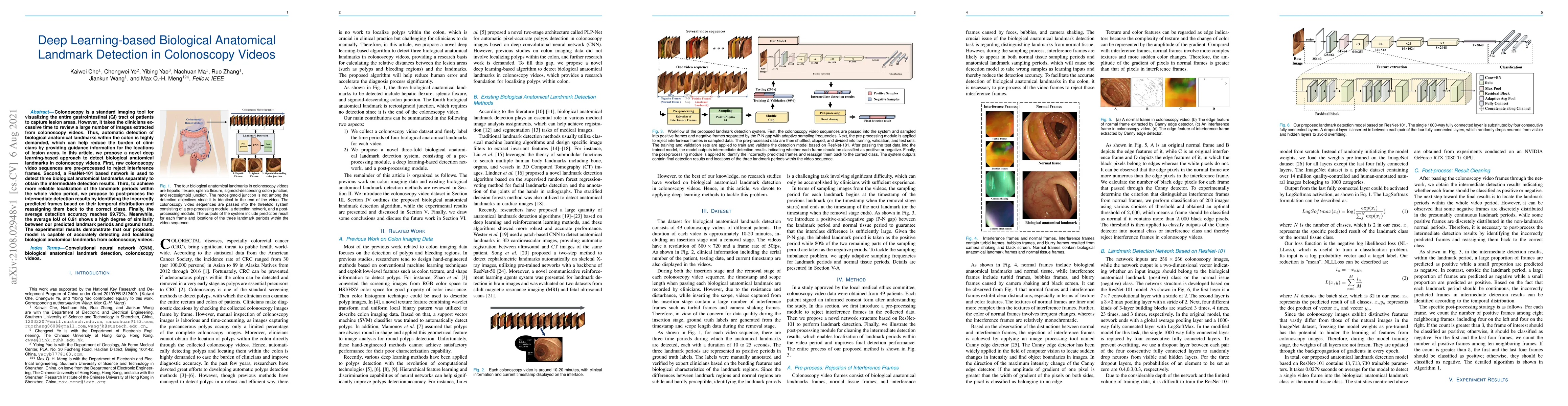 This paper proposes a deep learning-based method using a ResNet-101 network to detect biological anatomical landmarks in colonoscopy videos, significantly reducing clinicians' review time. The model achieves 99.75% detection accuracy and 0.91 IoU, demonstrating precise localization of landmark periods.