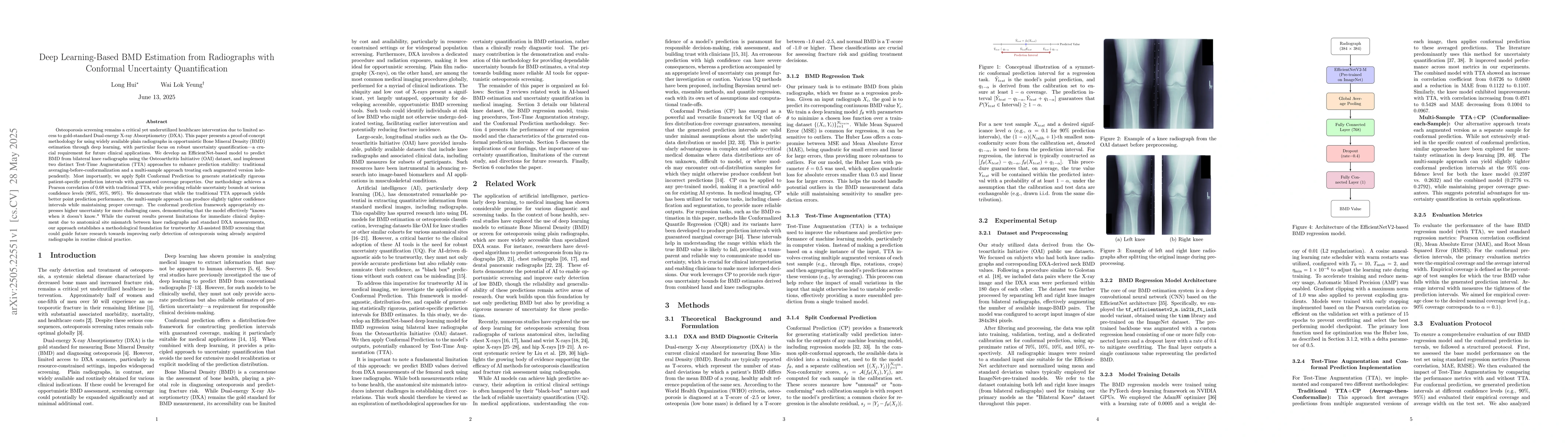 An EfficientNet model was trained on the OAI dataset to predict BMD from bilateral knee radiographs. Two Test-Time Augmentation (TTA) methods were compared: traditional averaging and a multi-sample approach. Split Conformal Prediction was implemented for statistically rigorous, patient-specific prediction intervals with guaranteed coverage.