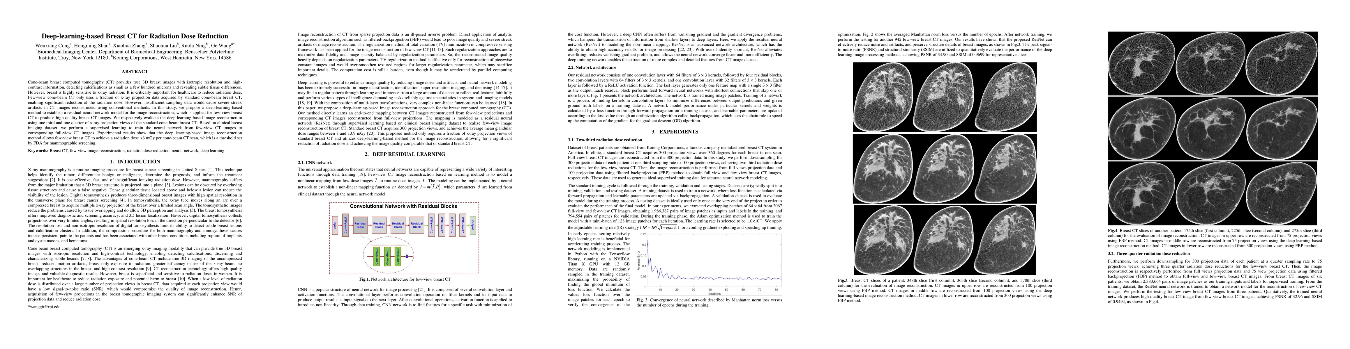 This study proposes a deep-learning-based method using residual neural networks to reconstruct high-quality images from few-view cone-beam breast CT scans, significantly reducing radiation dose while maintaining image quality. The method achieves a radiation dose of <6 mGy per scan, meeting FDA standards for mammographic screening.